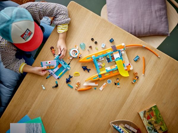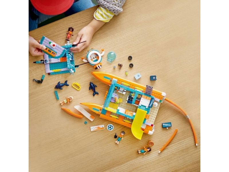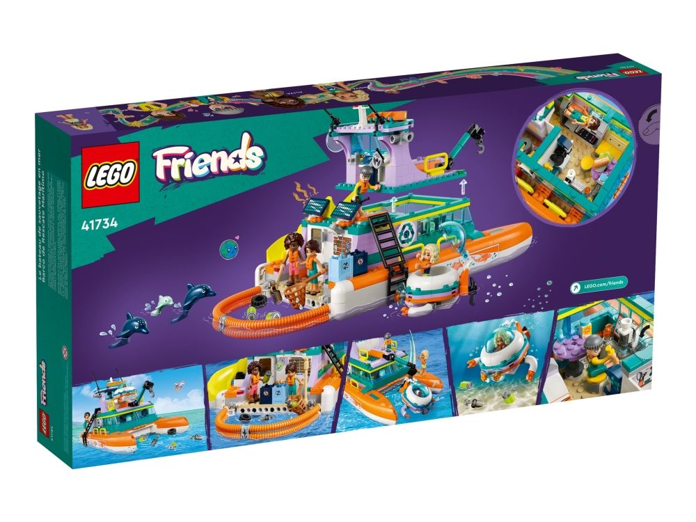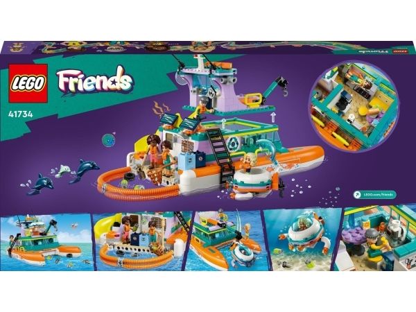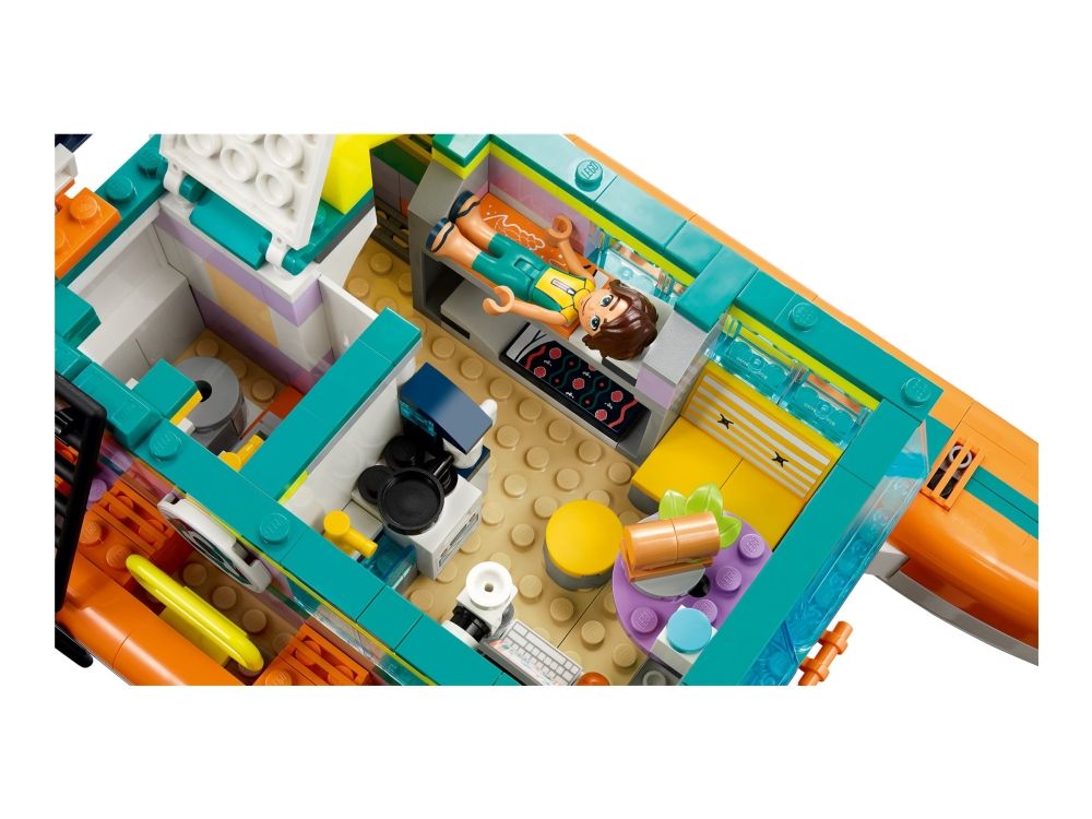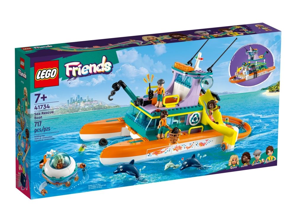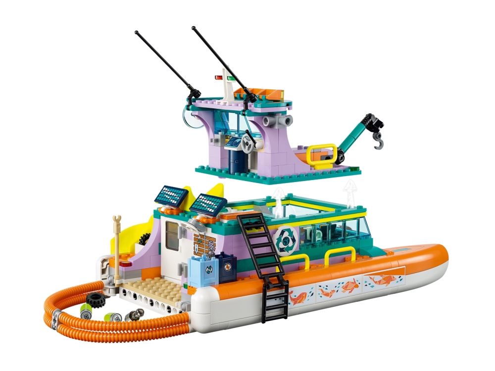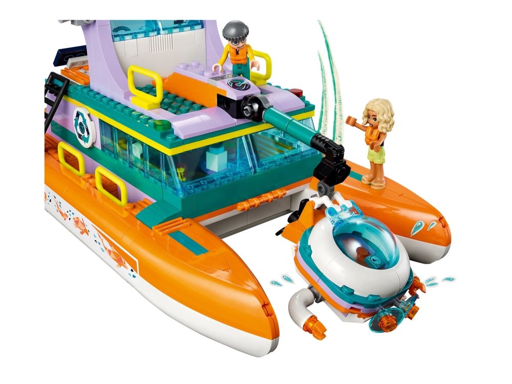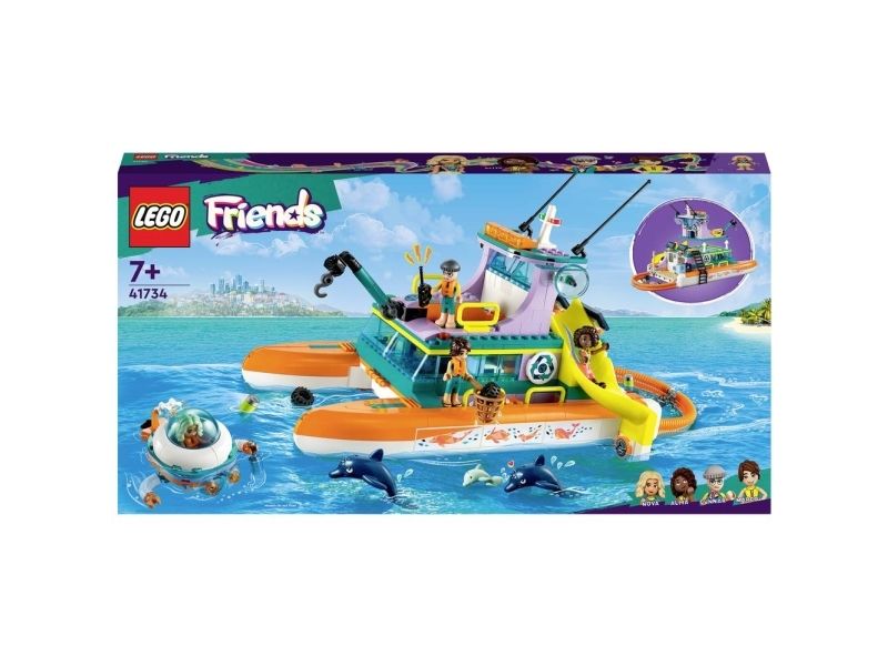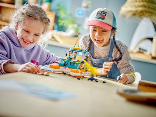 Naturinteresserte barn kan lære om livet i havet med det detaljerte byggelekesettet LEGO® Friends Redningsbåt for barn fra sju år. Settet inkluderer en byggbar katamaran som også er et laboratorium, samt en liten ubåtleke. Barn kan finne på spennende redningsoppdrag til havs og styre båten over søppel så det fanges opp av båtens nett, klart til å resirkuleres. Nova og Aliya trodde ikke de hadde så mye til felles, men de blir stadig bedre venner mens de jobber sammen på båten.