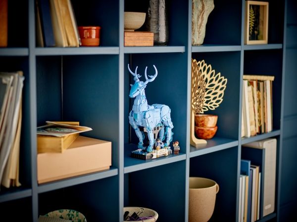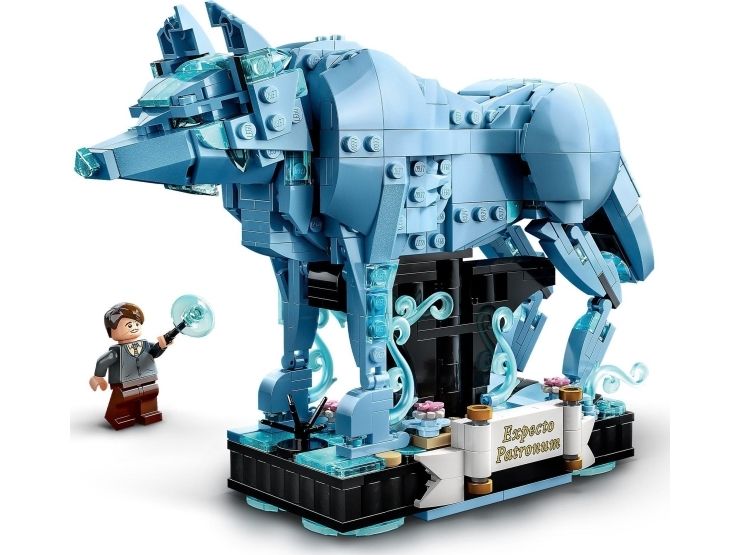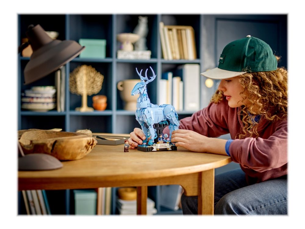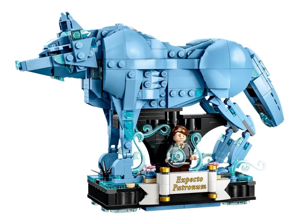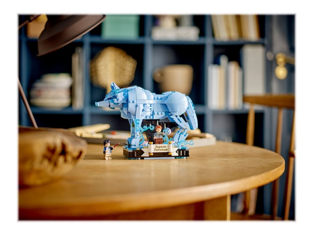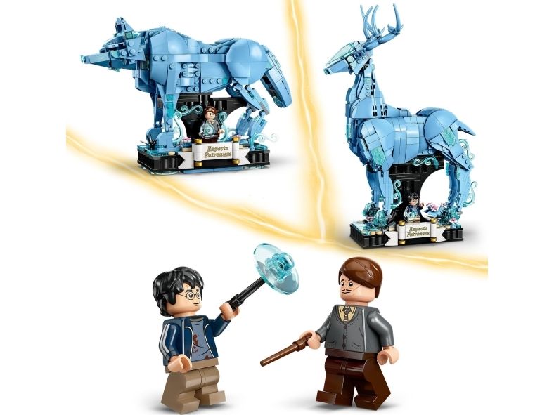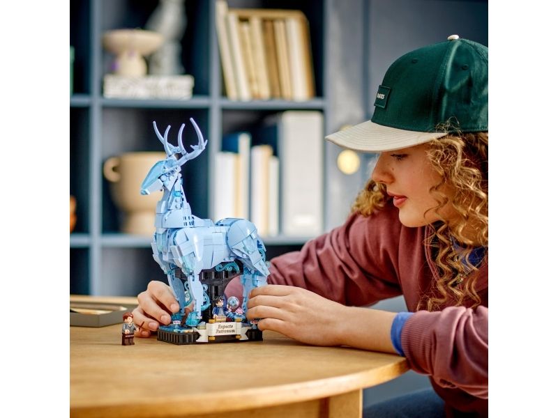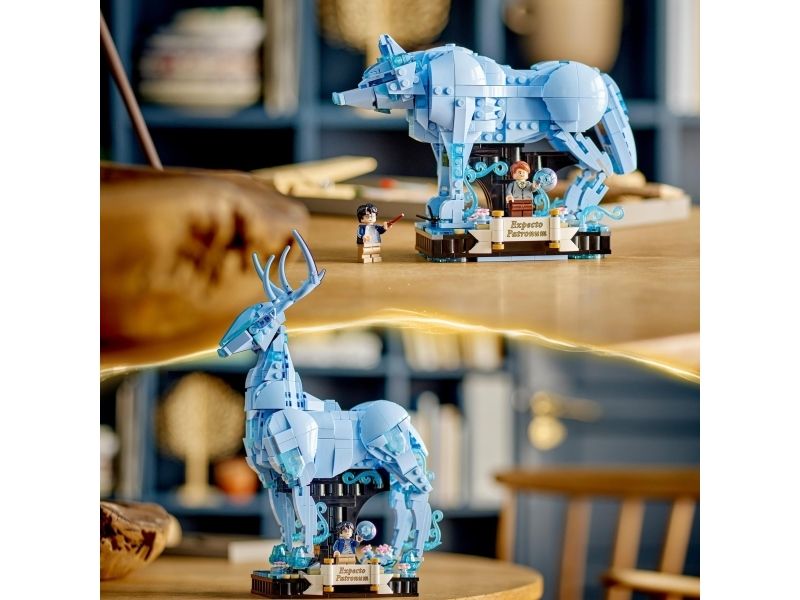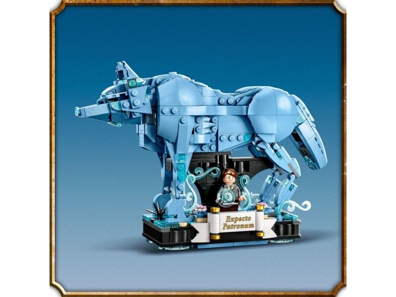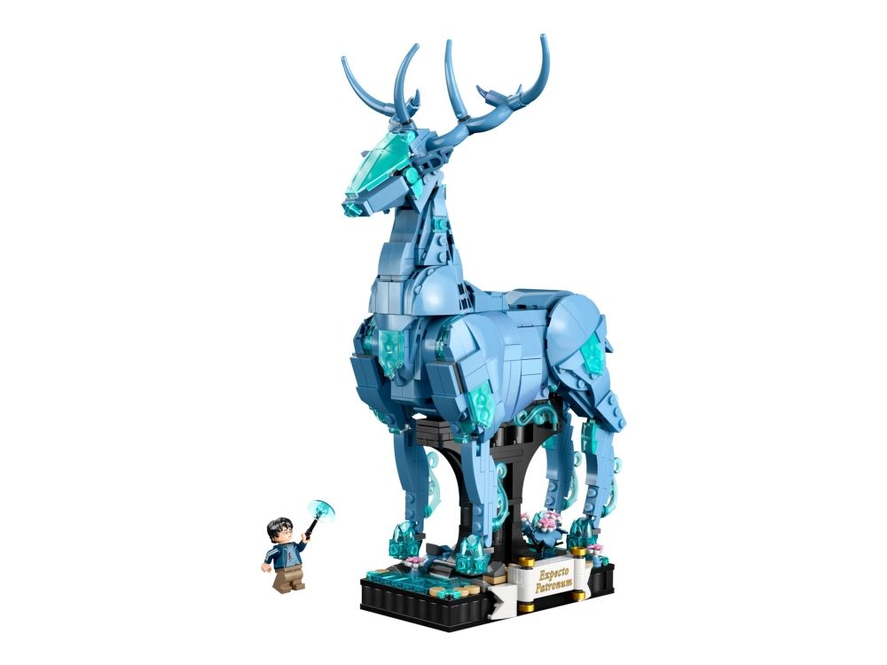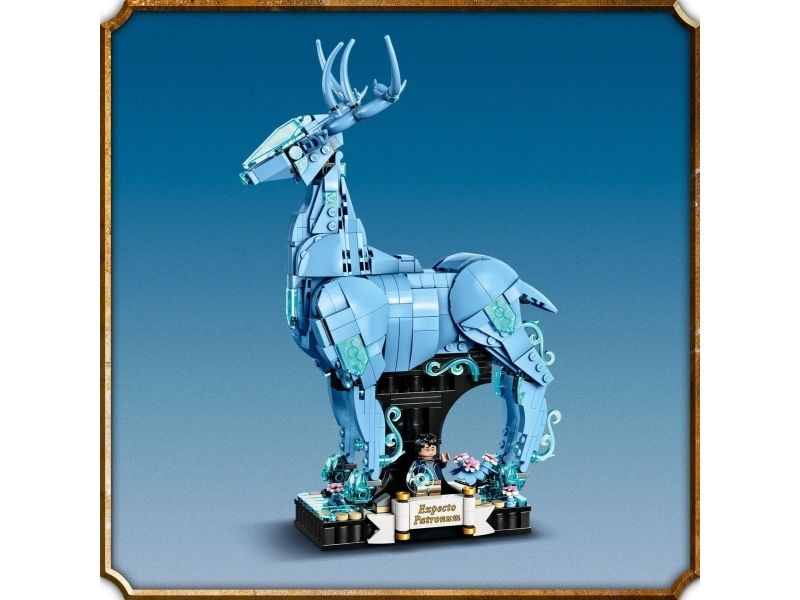 3. Kronhjort-skytsverge – med bevegelige bein, lyseblå, gjennomsiktige elementer som gir en spøkelsesaktig effekt, og en integrert utstillingssokkel med dekorelementerog plass til en minifigur av Harry Potter™
