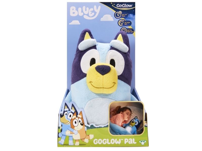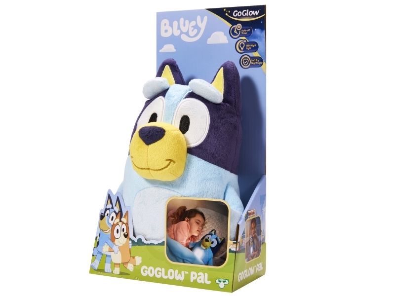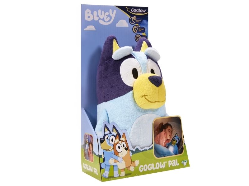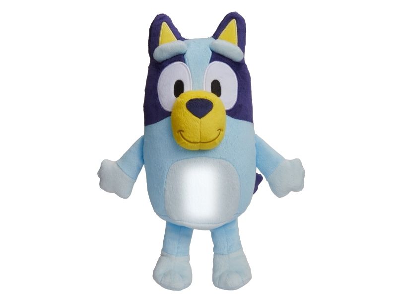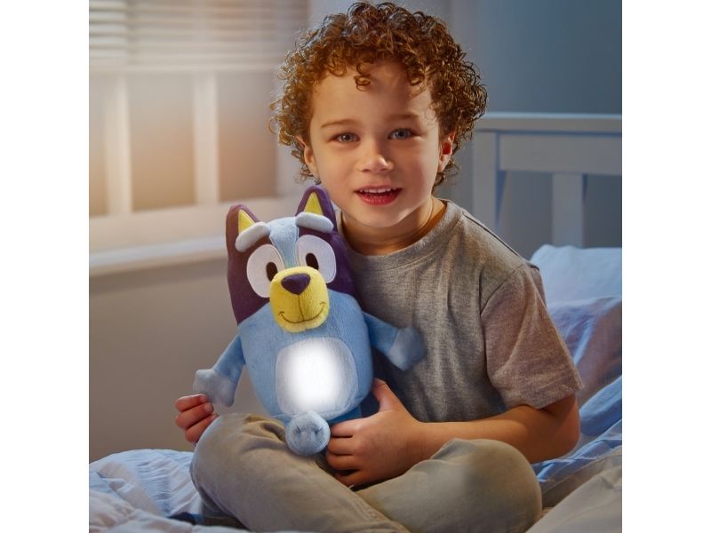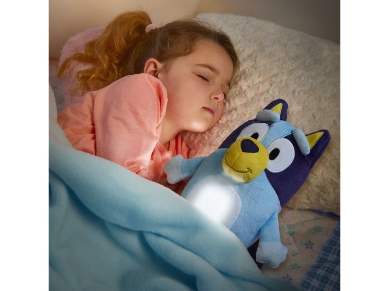 Du skal blot klemme Bluey, mens du giver hende en krammer og hun vil lyse, og give de små den ekstra smule mod, tryghed og lys ved sengetid.