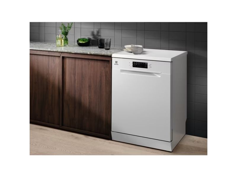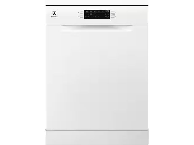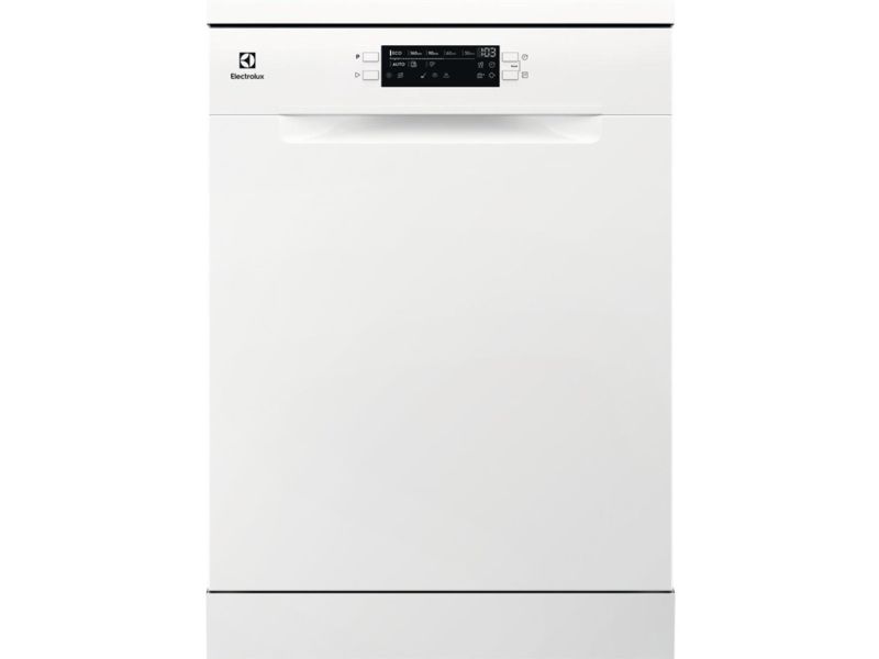 Brand- Electrolux. Model- ESA47300SW. Width- 59.8 cm. Depth- 62.2 cm. Height- 85 cm. Weight- 41.38 kg. Colour- White. Energy Efficiency Class- D. Water consumption per cycle- 9.9 l. Number of sets of dishes- 13. Dishwasher type- Free standing. Washing efficiency class- A. Drying efficiency class- A. Noise level- 46 dB. Eco program duration- 240 min. Number of applications- 8. Washing programs- Quick wash, Pre-rinse, Auto-program, Eco program, 160 minute program, 90 minute program, 60 minutes, Machine Care. Indicators- Rinse aid indicator, Salt indicator, End of cycle indicator. Control- Electronic. Water spill protection- Yes. Child safety function- No. Screen- Yes. Tool drawer- No. Automatic opening- Yes. Mandatory warranty- 24 mo. Postponement of the start of the program- Yes. Adjustable leg height- Yes.