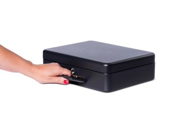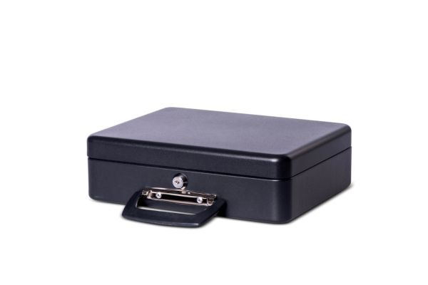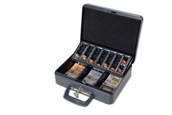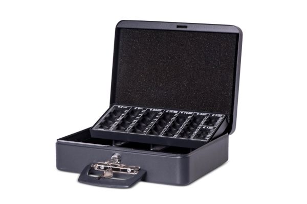 Removable, 3-piece compartment for notes. 1 sturdy handleCantilevered coin tray allows easy coin removalDesigned by MAULPowder-coated seamless steelSecurity cylinder look with 2 keysShock-proof plastic coin-trayEuro coin tray with scales of value for all 8 EuroLid remains open automaticallyLid contains profiled foam liner to keep coins in place during transitMAUL 5631490. Product colour: Black