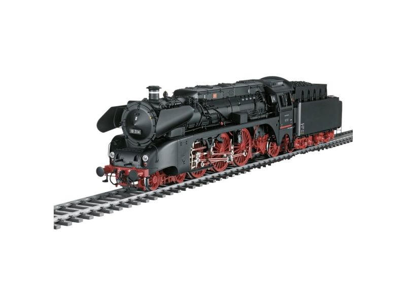 På en sort rock!Forbillede: Hurtigtogsdamplokomotiv 18 314 med kul-hovedfyring og kultender 2'2'T24 fra Deutsche Reichsbahn i DDR (DR/DDR). Ombygningsversion som forsøgslokomotiv fra VES-M Halle (Saale). Udførelse med eko-kedel og delbeklædning, på basis af damplokomotiv 18 314 (tidligere Badische Vh). Med Witte-vindskærm og ensidet Indssiemagnet. Driftstilstand for 1960.Model: Komplet nykonstruktion i metal. Understel, lokomotivopbygning med kedel og førerhus i trykstøbt zink. Andre anordele i videst muligt omfang af metal (MS). Krævende model med mange påsatte elementer og yderst detaljeret førerhus. Røgkammerdør, som kan åbnes. Bevægelige førerhusdøre og meget mere Med MFX-digital-dekoder med 32 funktioner, styret højkapacitetsdrev og lydgenerator med dæmpende kørestøj og omfattende lydfunktioner. Drift mulig med vekselstrøm, jævnstrøm, Märklin Digital og DCC. Indbygget bufferkondensator. Alle drivaksler drevet. Indbygget røggenerator med hjulsynkron dampudledning, flertrins cylinderdamp og dampfløjte. Motorlys, spidssignal med tre lys, der skifter med kørselsretningen, i en epoke-korrekt farvegengivelse. Forlygter konventionel i drift, kan kobles digitalt. Belysning med vedligeholdelsesfrie varmhvide LED'er. Rødt markeringssignal kan slås til/fra og førerhusbelysning. Digital omstillelig specialfunktion: Lokomotivføreren aktiverer regulatoren (med servostyret bevægelsesforløb som hvis lokomotivføreren aktiverer regulatoren i virkeligheden). Udstyret med fjederbuffere, lokomotivmodel foran med skruekobling, bagtil udstyret med fjernstyret telexkobling, (bagtil kan den udskiftes med skruekobling). Styreskift (frem-, tilbage, konstant drift) i 3 trin. Indbygget lokofører- og varmefigur. Der medfølger en udstyrspakke med en skruekobling, dampolie og handsker. Monteret på en sortlakeret aluminiumsokkel til vitrinepræsentationer. Kørbar minimumsradius 1.020 mm. Længde over buffer 73,8 cm. Vægt: Ca. 9,2 kg