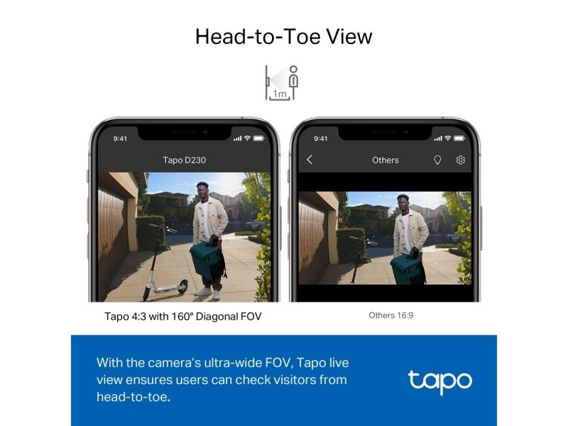 With the camera’s ultra-wide FOV(160° Diagonal), Tapo 4:3 live view ensures users can check visitors from head-to-toe as close as 1m†, which shows more vertical details than other 16:9 doorbells’.