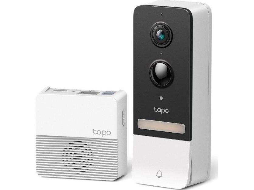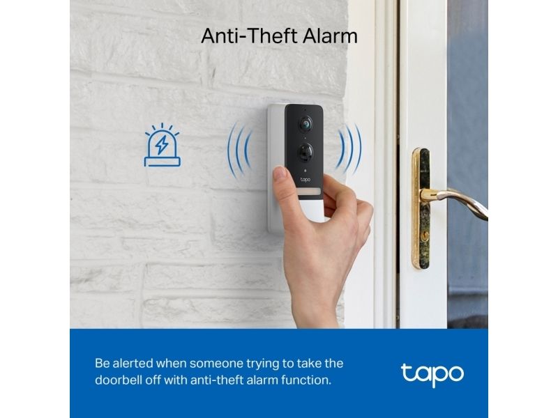 Be alerted when someone tries to take the doorbell off with the anti-theft alarm function.TP-Link Tapo Smart Video Doorbell Camera Kit. Product colour: Black, White, LED type: IR, Certification: CE, RoHS, RCM,R-NZ,FCC, EAC, Triman, UKCA. Audio formats supported: G.711. Megapixel (approx.): 5 MP, Maximum video resolution: 2560 x 1920 pixels, Maximum frame rate: 15 fps. Connectivity technology: Wireless, Wi-Fi standards: 802.11b, 802.11g, Wi-Fi 4 (802.11n), Frequency: 2400 MHz. Power source type: Battery, DC