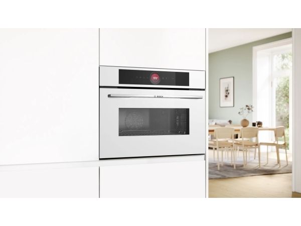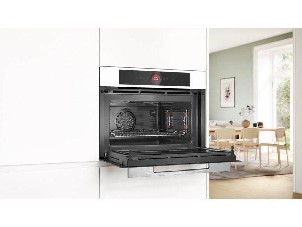 Discover the Bosch Serie 8 CMG7241W1, a combination oven designed to enhance your cooking experience. With its Wi-Fi connectivity and IoT compatibility, this oven brings convenience and efficiency to your kitchen, allowing you to control your cooking remotely. The Bosch Serie 8 offers a variety of cooking programs, from air frying to conventional baking, ensuring that every meal is prepared to perfection. Safety is a priority with features like child security and a fan cooling system, providing a safe cooking environment for your family. The oven's hydrolytic self-cleaning function makes maintenance a breeze, while the touch-sensitive control panel and TFT digital display ensure precise cooking control. Whether you're a seasoned chef or a culinary novice, the Bosch Serie 8 CMG7241W1 is the perfect addition to your kitchen, promising delicious results with every use.