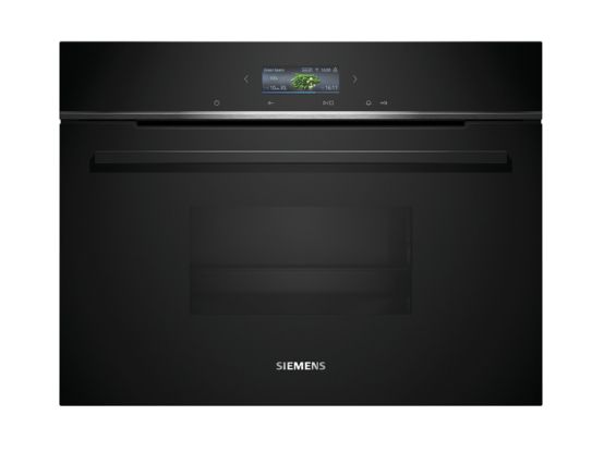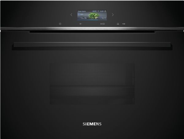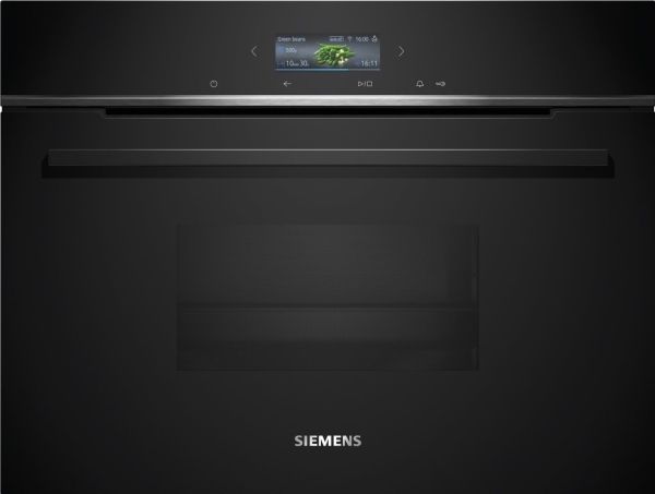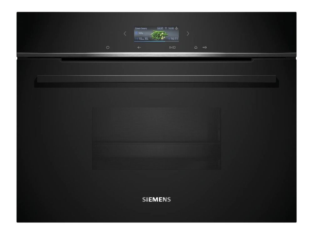 Discover the Siemens iQ700 CD714GXB1, a steam oven designed to elevate your cooking experience. This built-in electric oven features a TFT digital display and electronic controls for precise cooking settings, ensuring your meals are always cooked perfectly. Safety is paramount with auto shut-off, child security, and a fan cooling system. The oven offers a variety of cooking programs, including defrost, dough proving, reheat, and steam, along with four heating modes, making it a versatile addition to any kitchen. The 38-liter capacity and included accessories like a large perforated steaming tray, steam tray, and cleaning sponge, coupled with a 1.3-liter water tank, offer convenience and efficiency. The Siemens iQ700 is also Wi-Fi enabled, allowing for easy integration into your smart home system for remote operation. With its sleek design, this oven not only enhances your kitchen's aesthetics but also your culinary creativity.