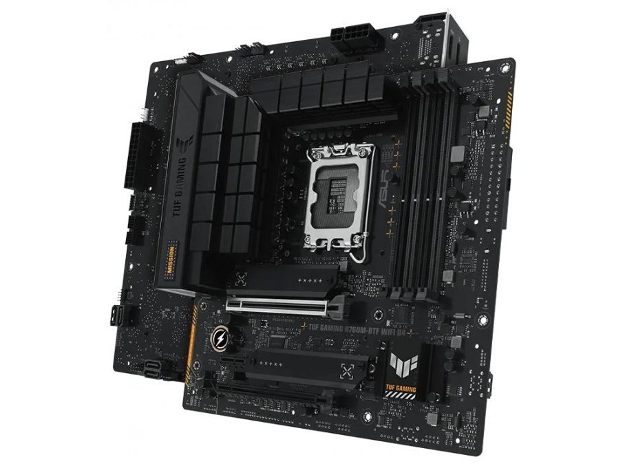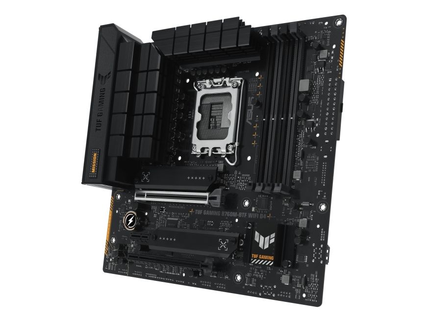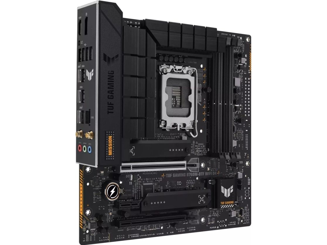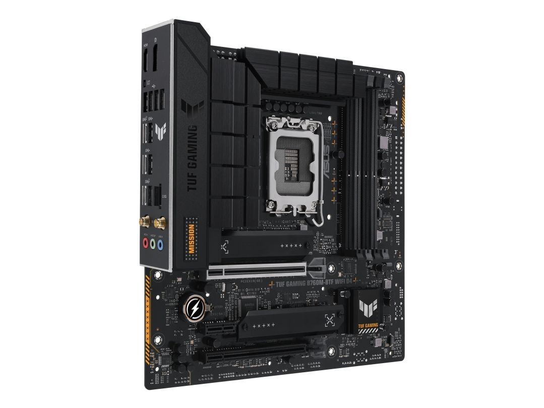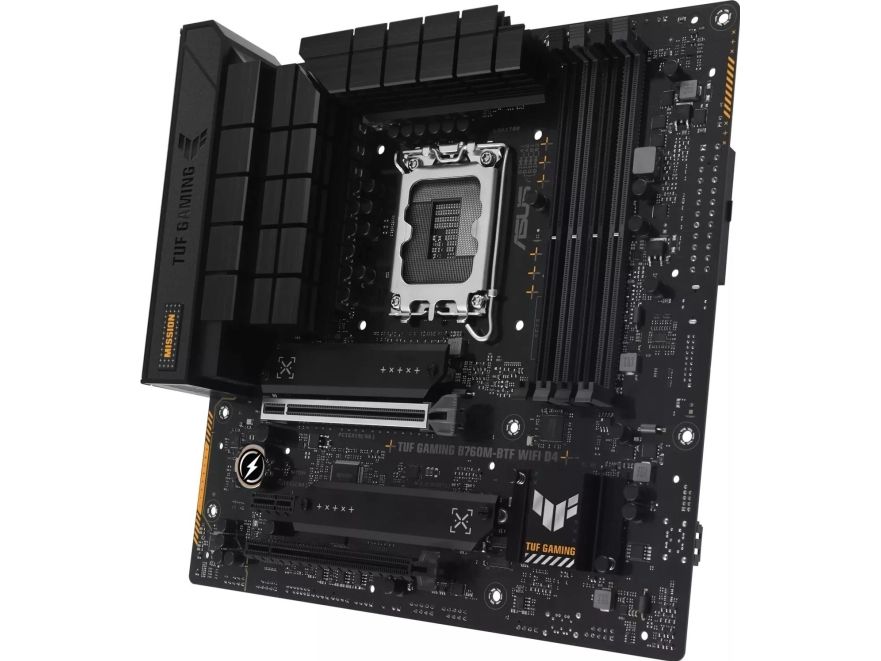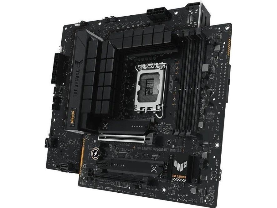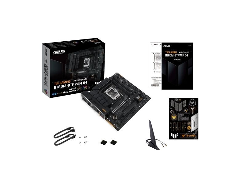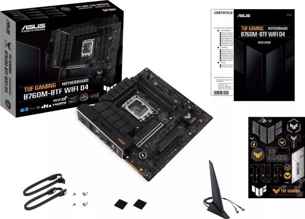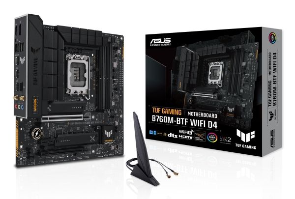 TUF GAMING B760M-BTF WIFI D4 takes all the essentials of the latest processors and combines them with game-ready features and proven durability. "BTF" stands for "Back To (the) Future" for a new era for all DIY PC gamers; the BTF series hides all connectors on the underside of the motherboard for clean cable management and a minimalist construction look. This motherboard is designed with military-grade components, an upgraded power solution, and a complete cooling system to exceed expectations with solid performance and gaming marathons.
