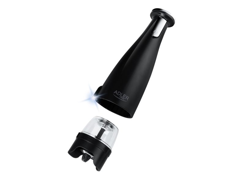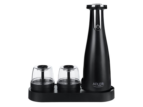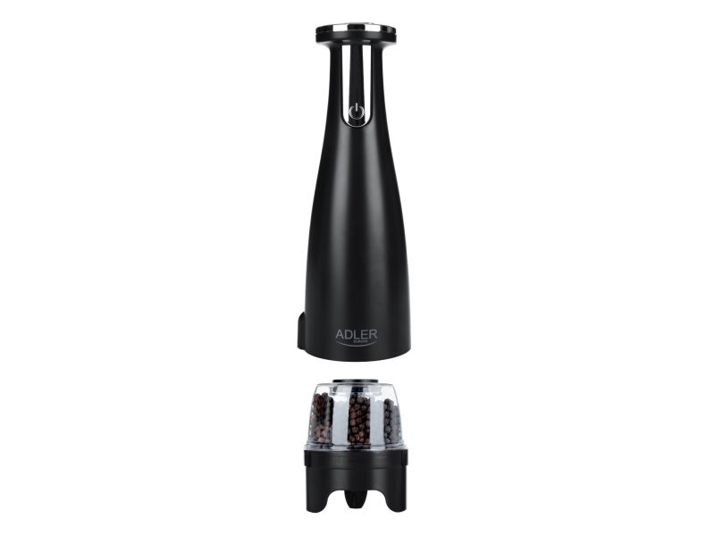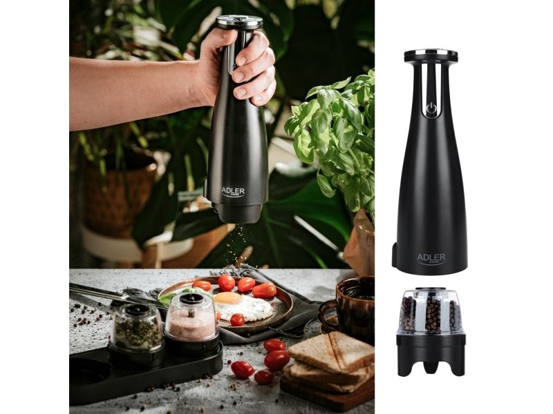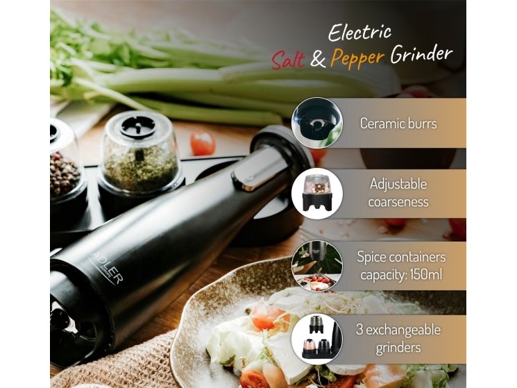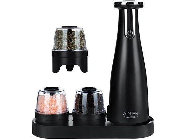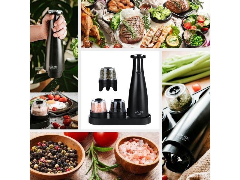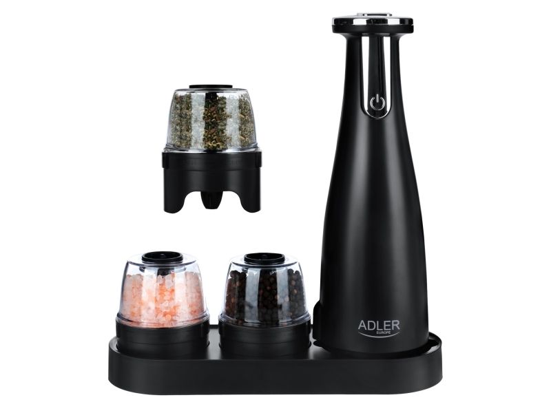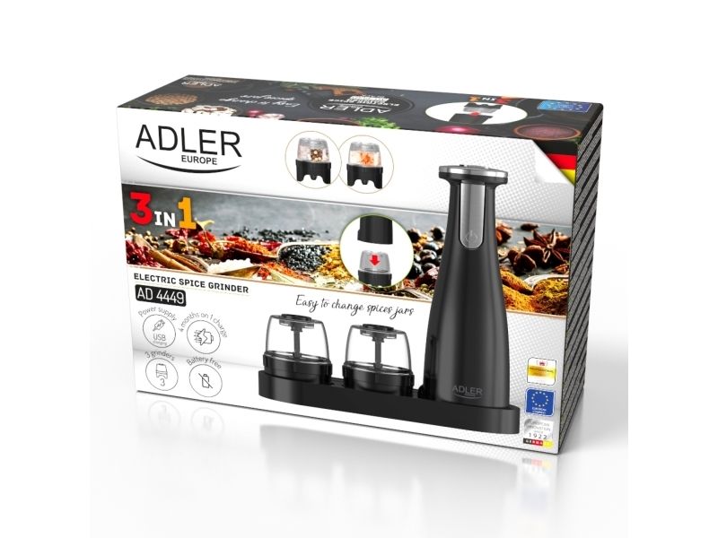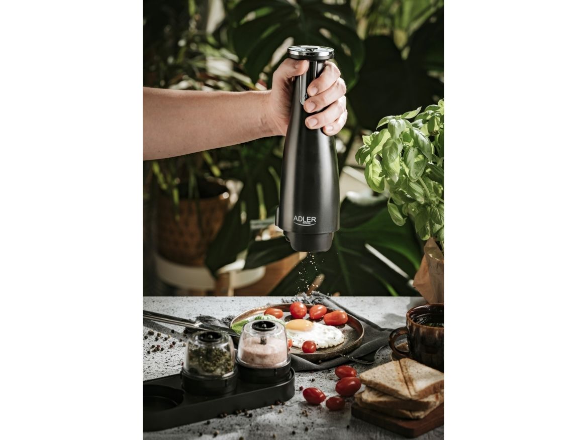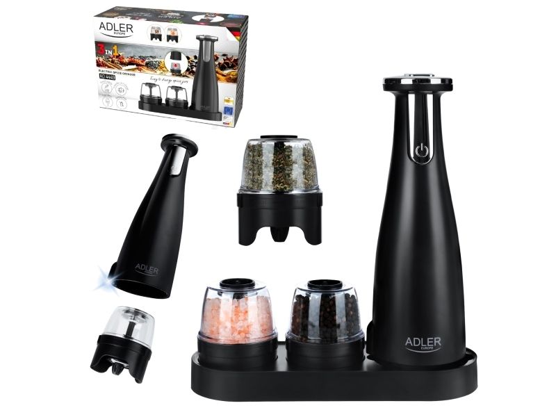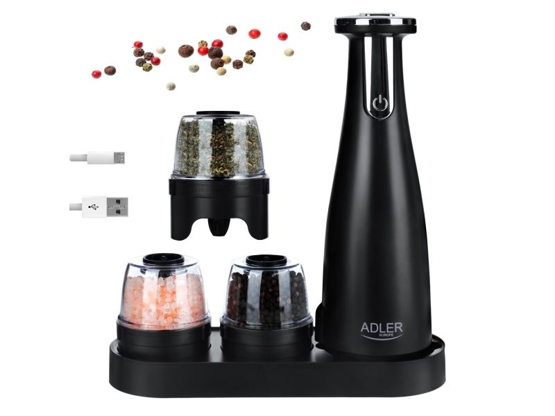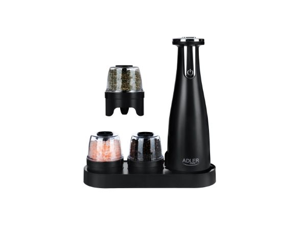 Adler | Elektrisk salt- og pepperkvern | AD 4449b | Kvern | 7 W| Karosserimateriale ABS-plast | Litium | Kverner med keramiske kverner; Lade lys; Automatisk avstenging etter: 3 minutter; Fulladet for 120 minutters kontinuerlig bruk; Ladetid: 2,5 timer; Kabellading: USB-C-USB-A; Kvernkapasitet: 150ml; Inkluderer: base, 3 utskiftbare kverner, brett, USB-ladekabel | Matas Juodas