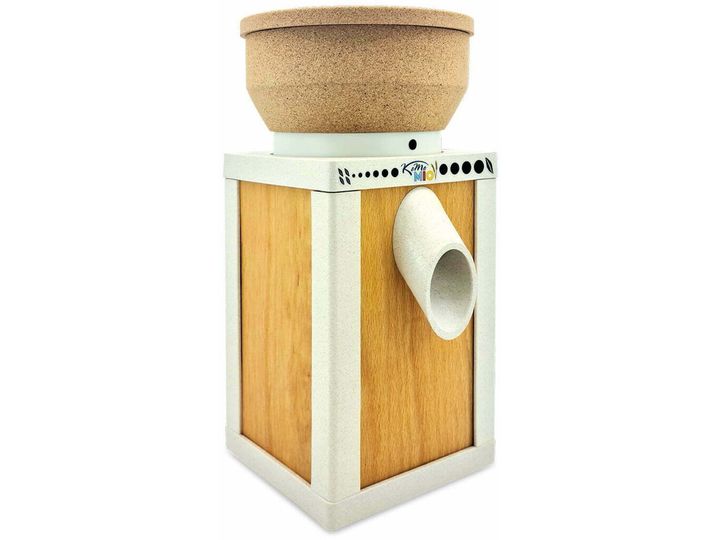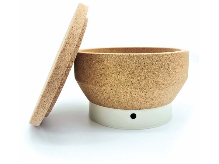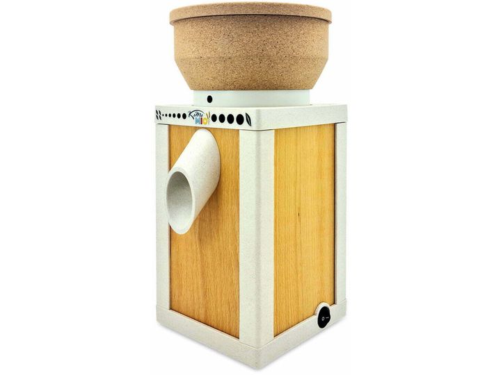 Denne modellen har fått et skudd kork i lokket og beholderen, mens sidene på kvernhuset er bygget i massiv kryssfinér av bøk.