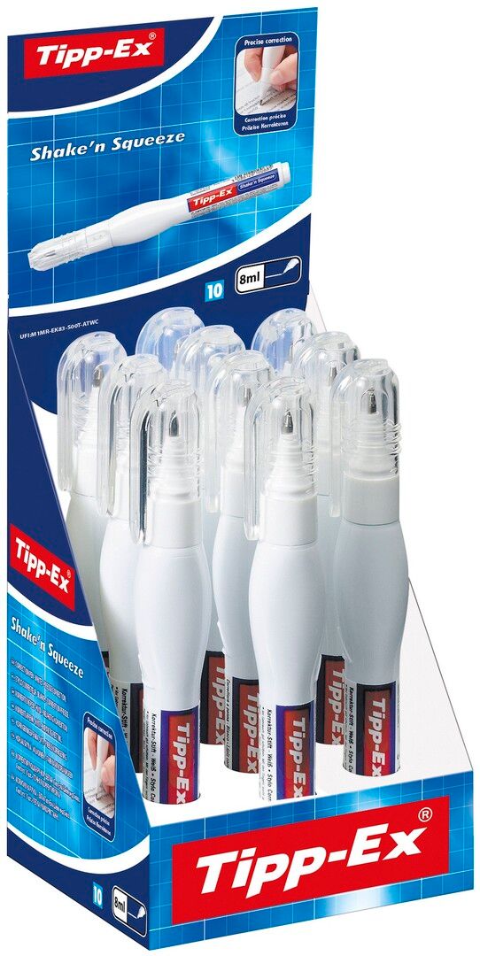 Rettepen, Tipp-Ex® 8 Shake'n Squeeze Pletter? En skrivefejl? Et ord for meget eller for lidt? Det er lige meget. Med rettepennen kan du nemt og præcist dække tekst eller andet på papiret. Penformen gør det nemt at styre, hvor du placerer produktet. Den indeholder 8 ml. Hurtigtørrende, ekstra dækkende og fordeles jævnt og præcist. Best.enhed: stk. Kolli a 10 stk. Yderkarton a 120 stk.