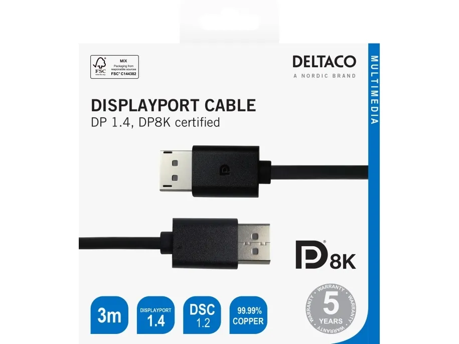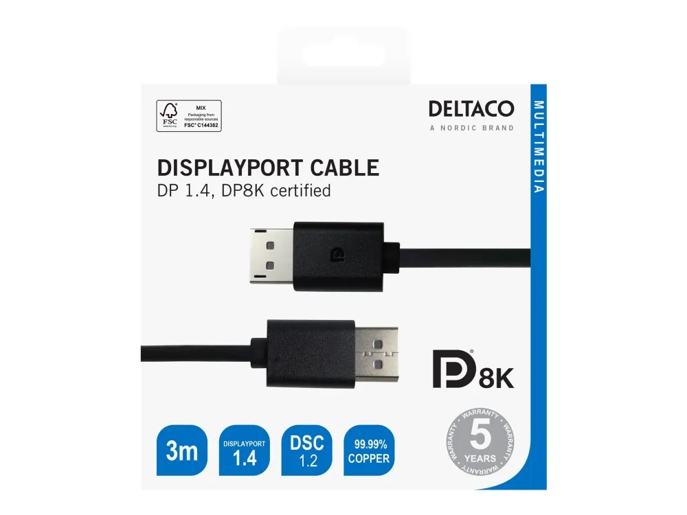 DELTACO - DisplayPort-kabel - DisplayPort (hann) til DisplayPort (hann) - DisplayPort 1.4 - 3 m - 8 K 60 Hz (7680 x 4320) støtte, ikke-låsende - svart