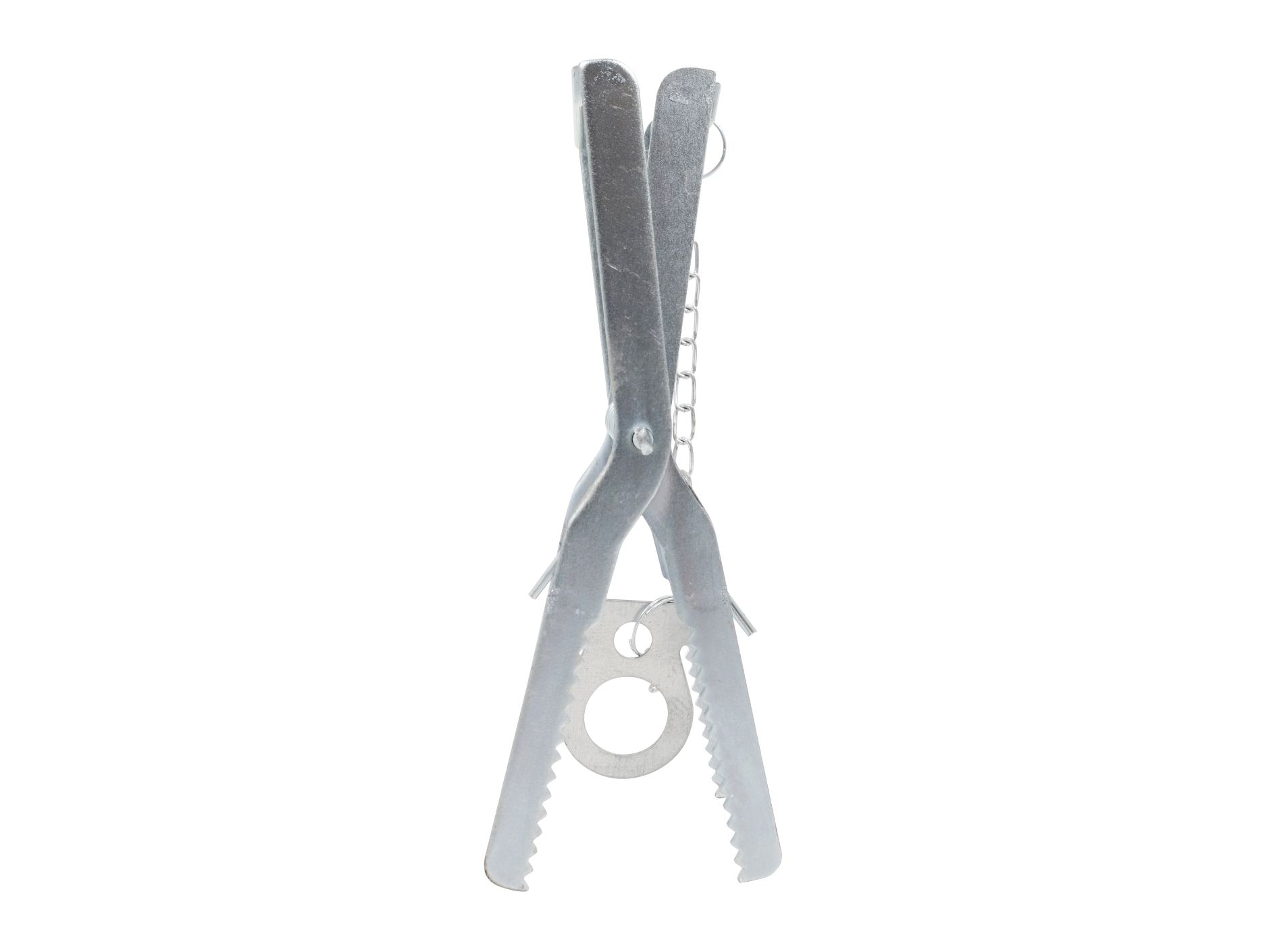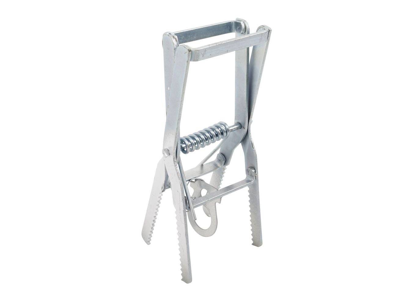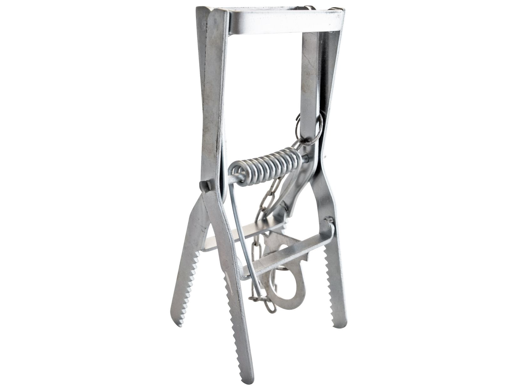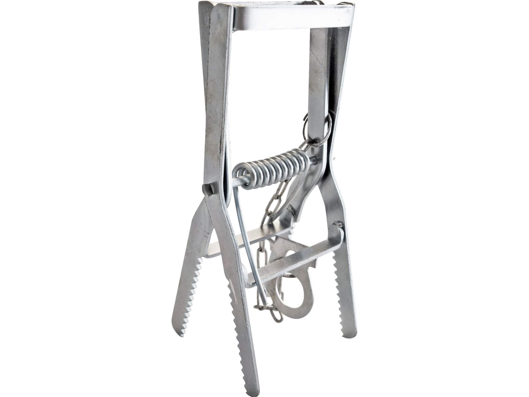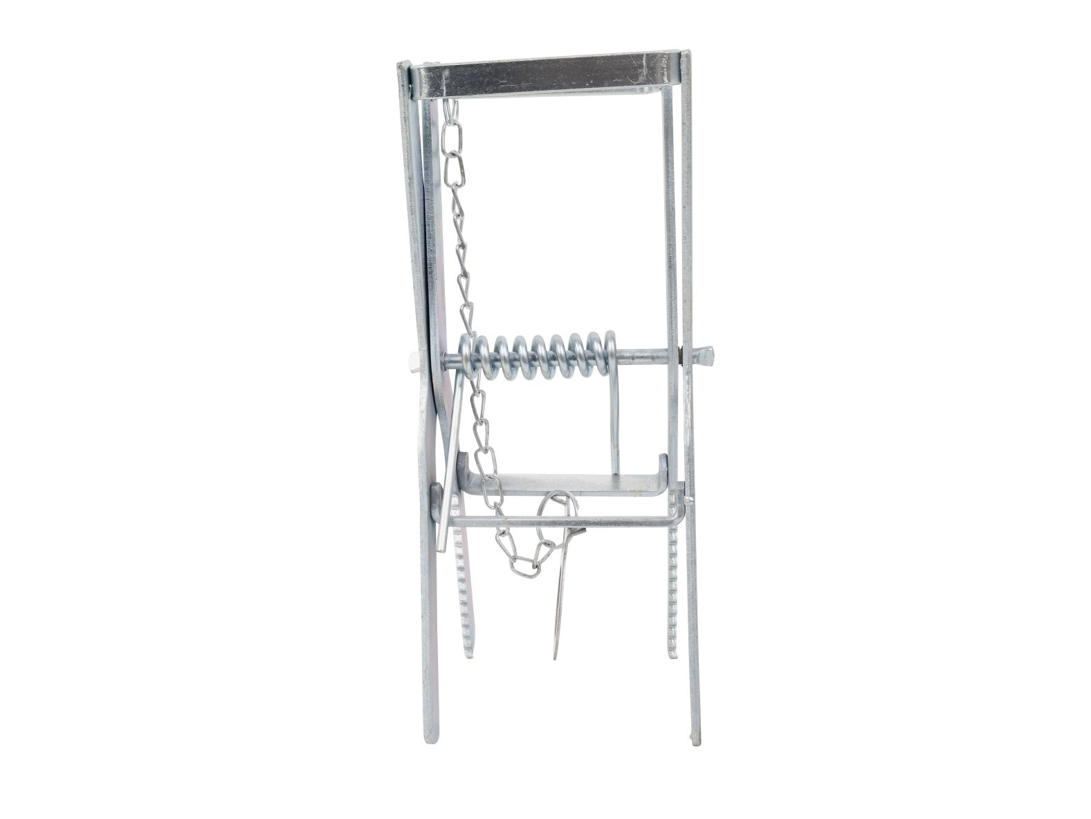 Muldvarpesaks med fjeder og klo til bekæmpelse af muldvarpe, som avnvendes ved at spænde og placere den i et hul i muldvarpeskuddet