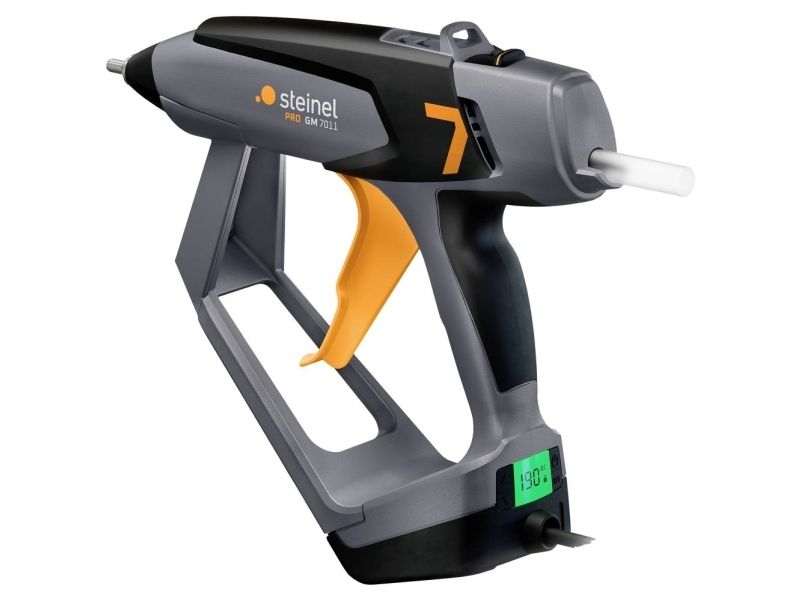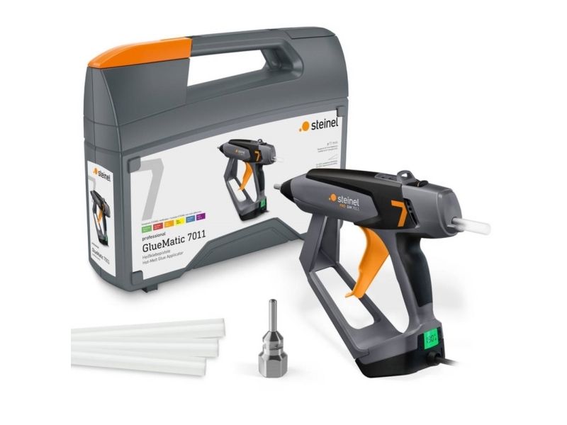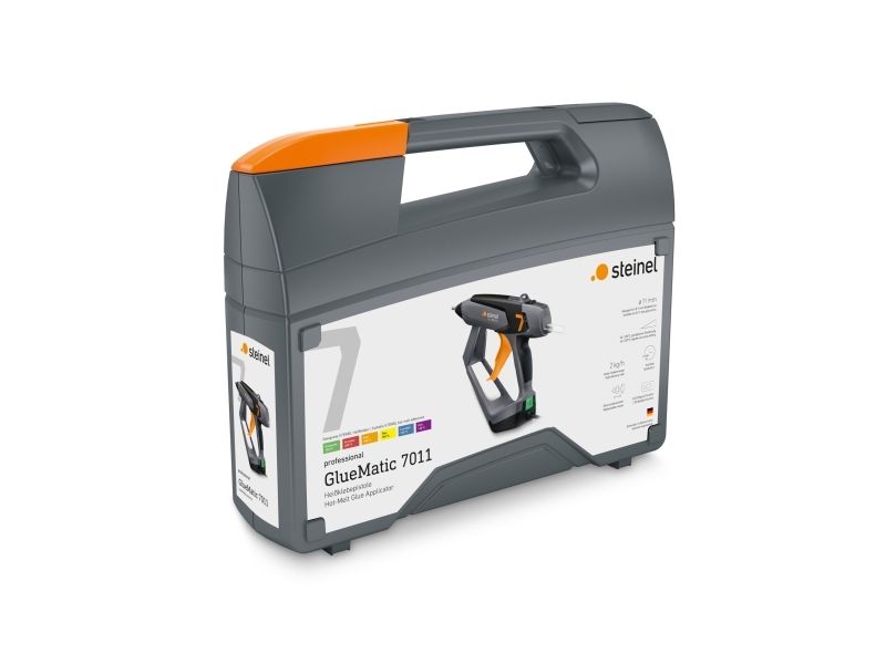 Steinel professionel limpistol GlueMatic 7011 kuffert sæt Digitalt indstillelige temperaturtrin fra 40 - 230 °C. Individuelt indstillelig klæbemængde pr. hub Udskiftelig dyse Hurtig opvarmningstid på < 2 min. Kraftig kapacitet 35 g/min. Softgrip Dvaletilstand
