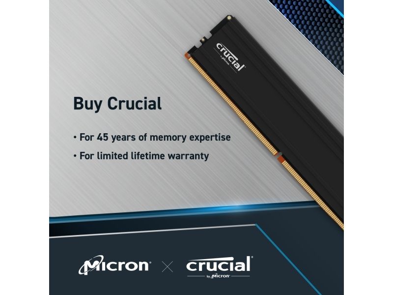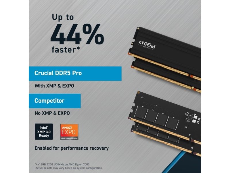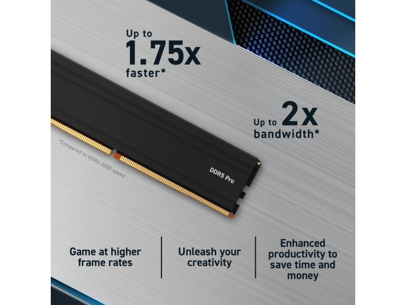 Crucial DDR5 Pro Memory has the blazing speed and massive bandwidth needed to support next-gen multi-core CPUs without the fuss of overclocking, latency tuning, die chasing, and LEDs. This advanced technology empowers your system to multitask better, load, analyze, edit, and render faster. Game with higher frame rates, uncover data insights faster, enhance productivity to save time and money, significantly reduce lag for heavy workloads and optimize power efficiency over the previous generation with Intel XMP 3.0 and AMD EXPO support on every module. Crucial DDR5 Pro Memory can enable your computer to harness performance that was once only possible with extreme performance memory.