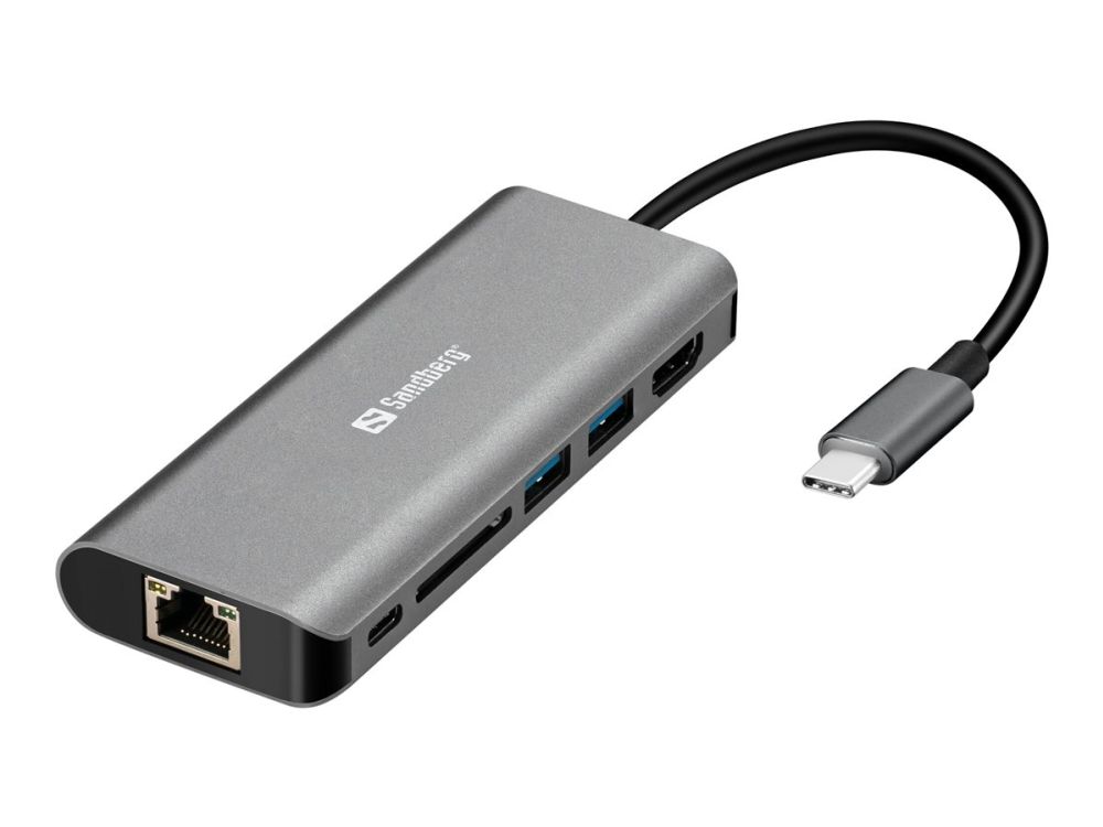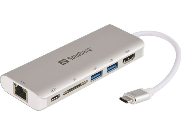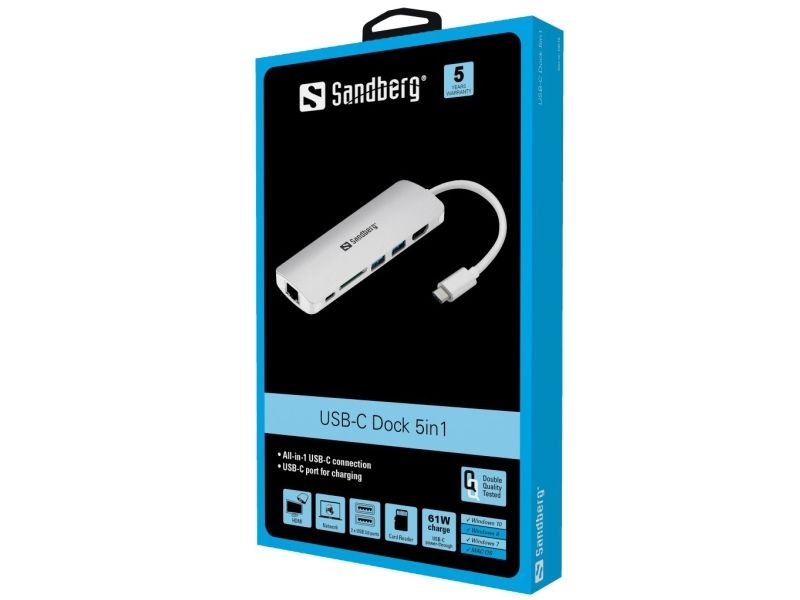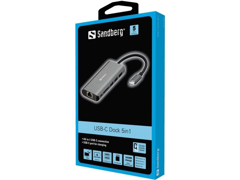 Sandberg USB C Dock gir deg mange nyttige tilkoblingsmuligheter for datamaskinen med USB-C-port. Med HDMIutgang kan du koble til en ekstra skjerm, TV eller projektor. Du kan tilslutte eksterne USB-enheter med USB 3.0-porten. RJ45-kontakt for kablet nettverksforbindelse. Med innebygd SD-kortleser kan du også lese og skrive direkte på SD-minnekortet. USB-C-kontakten har en forlengelse for tilkobling av strømforsyning, slik at Macbook ikke vil gå tom for strøm mens dokken er tilkoblet.