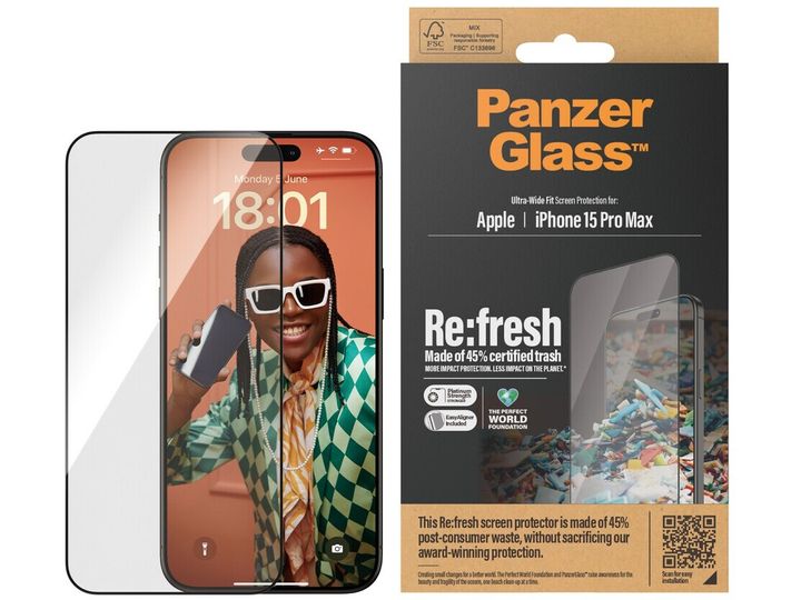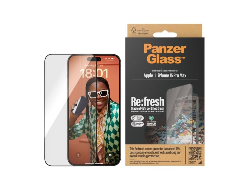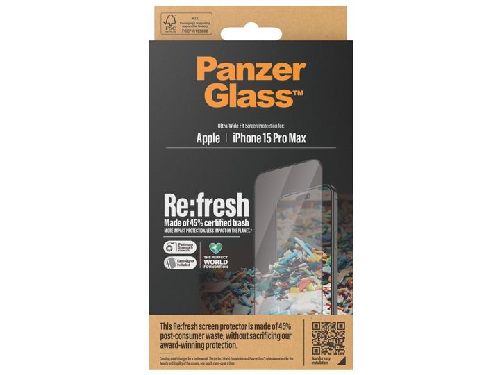 Want less waste? And more screen protection? The brand-new Re:fresh screen protector from PanzerGlass is made of 45% certified trash and will keep your screen safe from accidental bumps against sharp-edged dangers, crushing falls onto stone-hard pavements and other hazards of everyday life. The scratch, shock and drop-resistant screen protector even has a smudge-free coating that reduces traces of fingerprints and grease to give you a clear screen view. And this product comes in a box made of recyclable FSC-certified paper.Prolonging the lifetime of our devices, thereby postponing the need to produce new ones, is one way of working toward a more sustainable future. Another is to protect the world's wildlife and reduce plastic waste in nature. To this end, PanzerGlass has teamed up with non-profit organization The Perfect World Foundation to support "Project Ocean". For each Re:fresh sold, PanzerGlass will make a donation to the project, dedicated to protecting marine life, for instance by reducing the amount of plastic and ghost nets that end up in our oceans.The screen protector comes with an EasyAligner that makes installation a piece of cake (seriously!), and to make it even easier, we've included step-by-step instructions as well as a QR code for quick access to our online how-to video. And remember: Once the screen protection is applied, you'll never again fear the sight of your phone tumbling to the ground screen first. This may not happen, but if it does, you'll regret not having clicked "add to cart".The screen protector is Ultra-Wide Fit, meaning it covers the front surface of your phone, providing a complete and crystal-clear view of your screen, while still leaving a little room around the edges for a PanzerGlass case. If you want 360-degree phone protection, combine the screen protector and case with a PanzerGlass PicturePerfect camera lens protector.