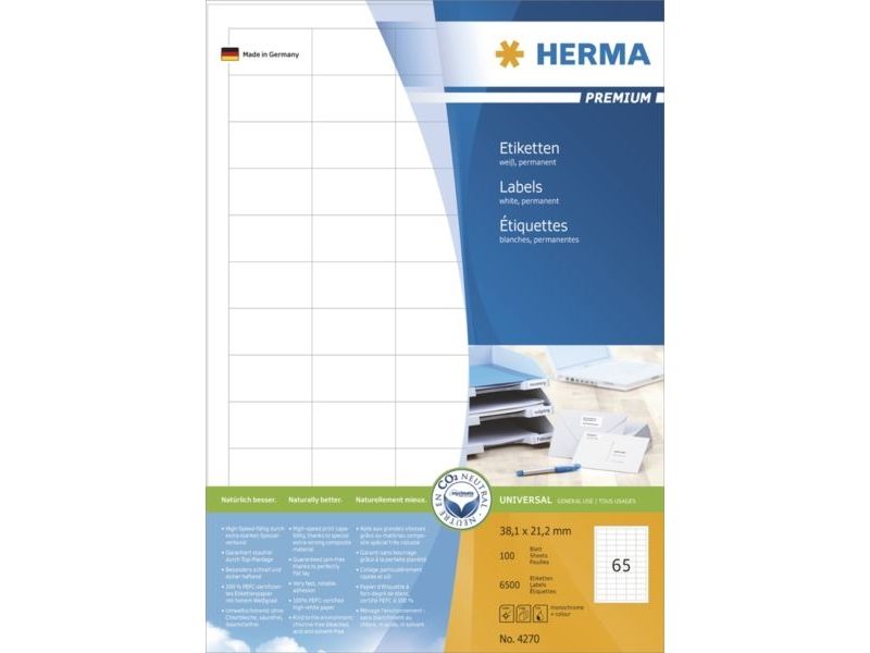 HERMA Premium - Papir - matt - permanent selv-adhesiv - hvit - 38.1 x 21.2 mm 6500 etikett(er) (100 ark x 65 laminerte etiketter