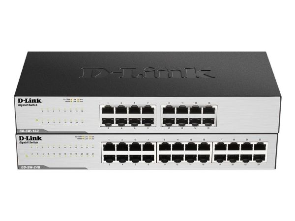 The dlinkgo GO-SW-16G 16-Port Unmanaged Gigabit Switch and GO-SW-24G 24-Port Unmanaged Gigabit Switch each offer an economical way for SOHO and small to medium businesses (SMB) to deploy an energy-efficient switch that benefits from the increased bandwidth of Gigabit Ethernet.