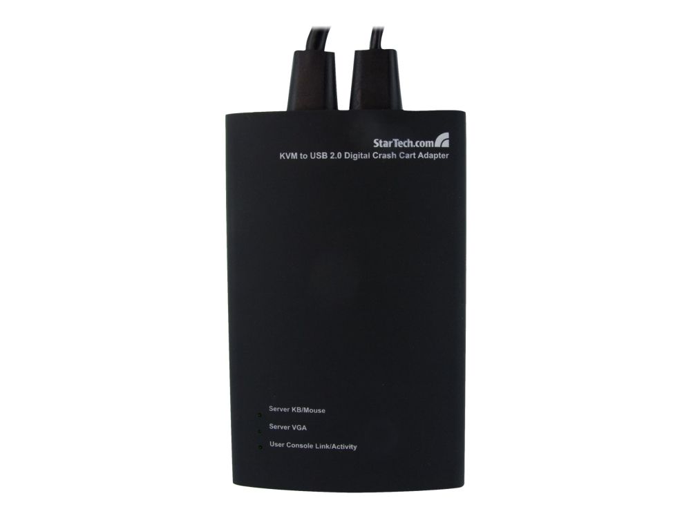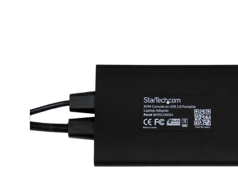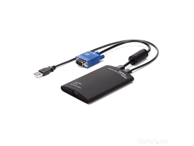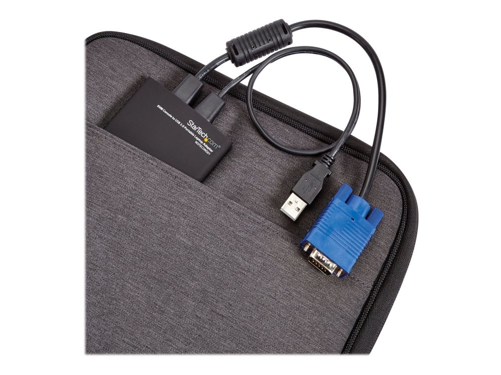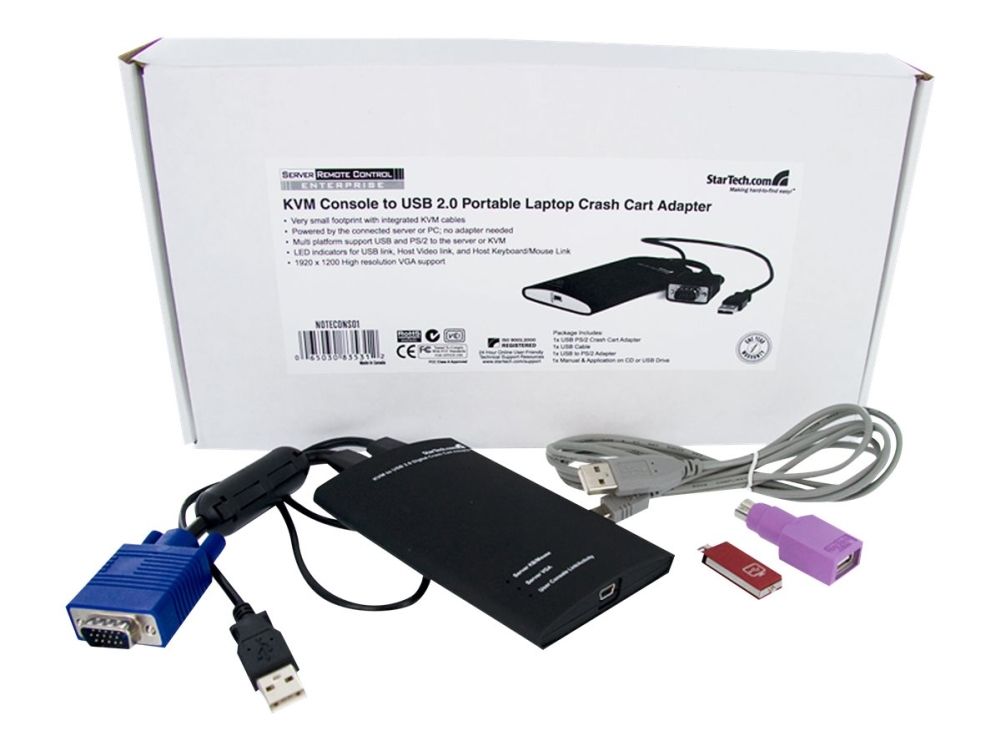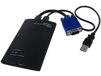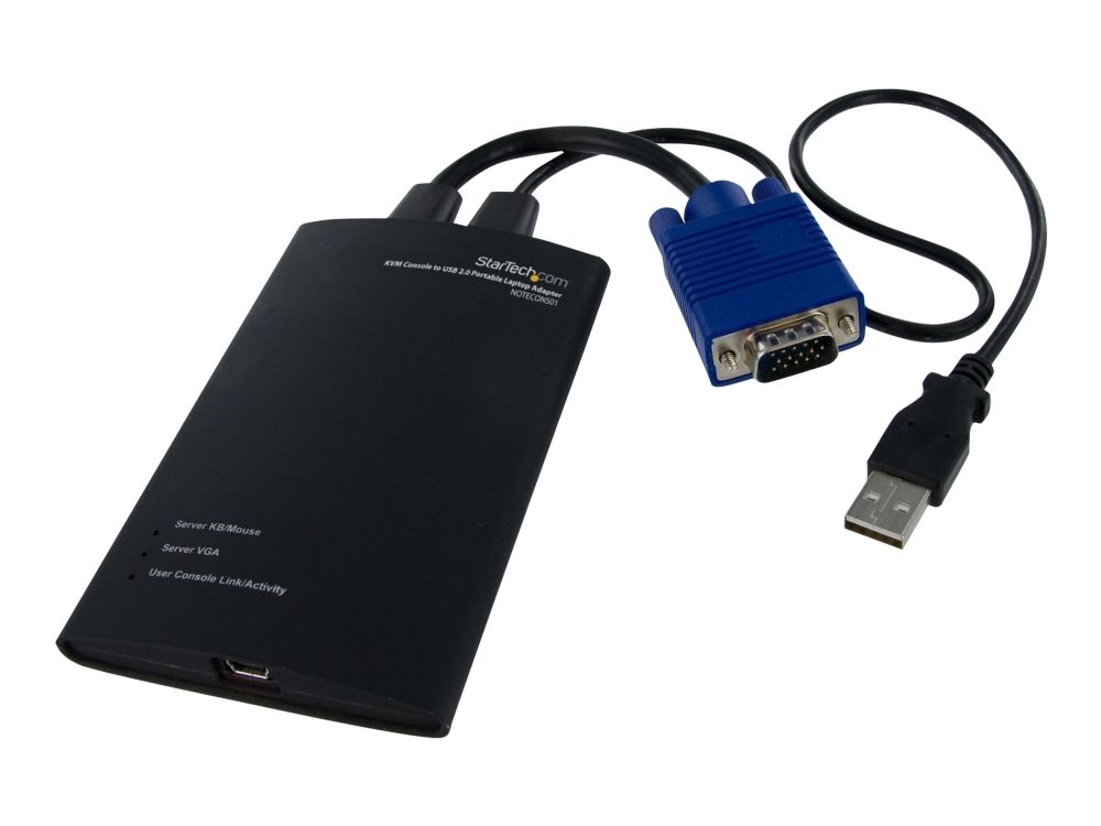 NOTECONS01 KVM-konsol till USB 2.0 akutvagn-adapter för bärbara datorer gör om din laptop eller minidator till en bärbar akutvagn för servrar och du slipper släpa runt på en stor och otymplig skärm, tangentbord och mus. Adaptern levererar VGA-strömmen från en värddator till en bärbar dator och emulerar utdata från tangentbord och mus för enkel åtkomst samt kontroll över anslutna servrar, datorer och andra fjärradministrerade enheter.