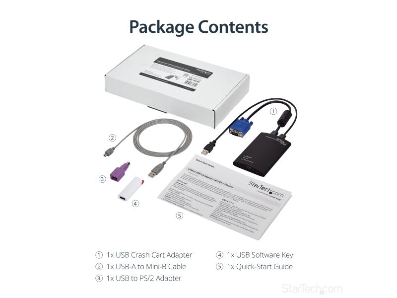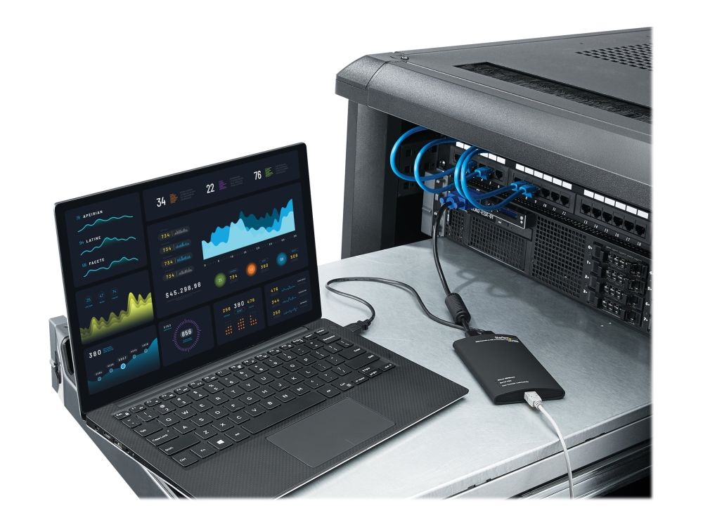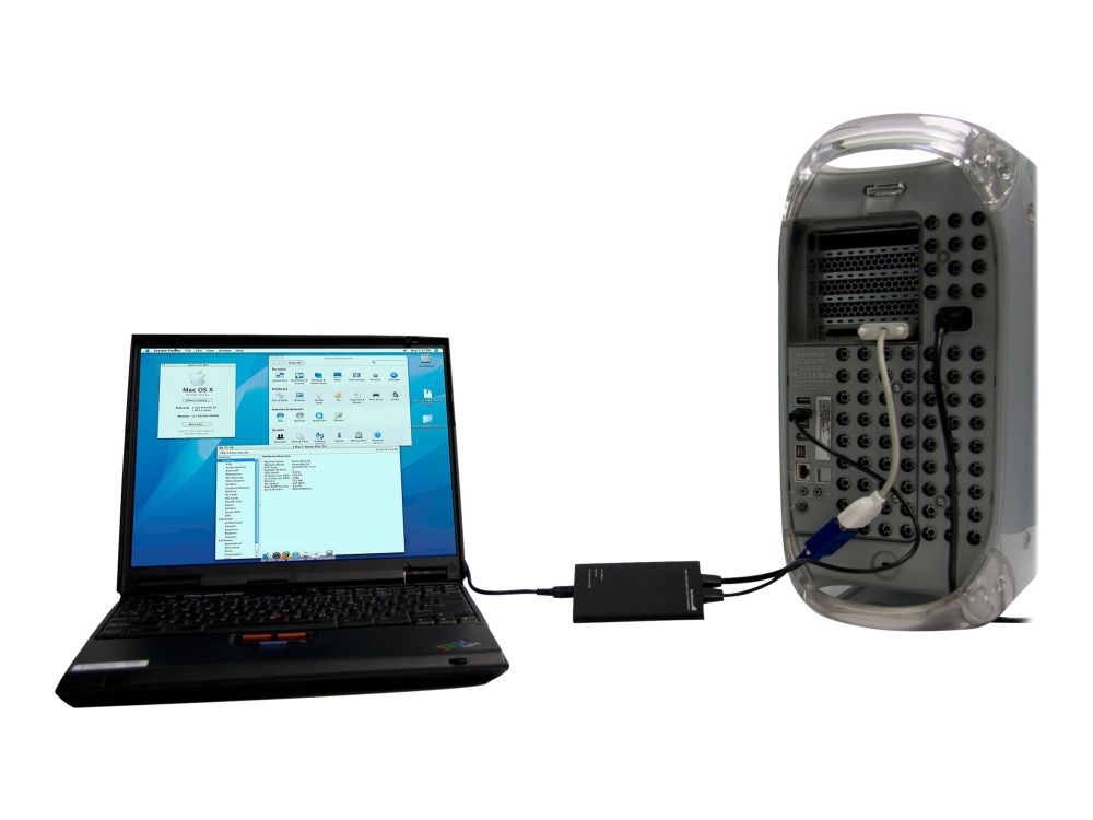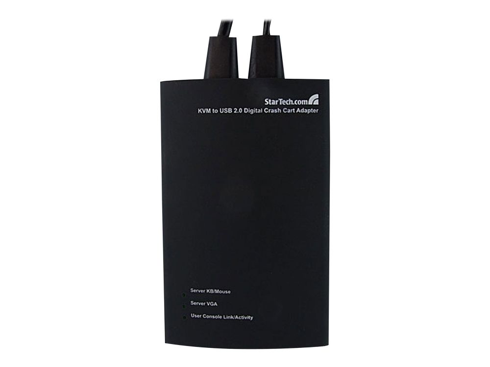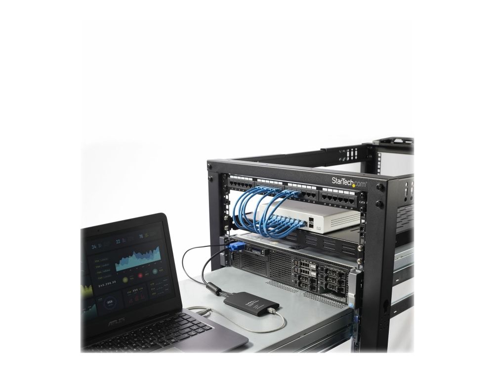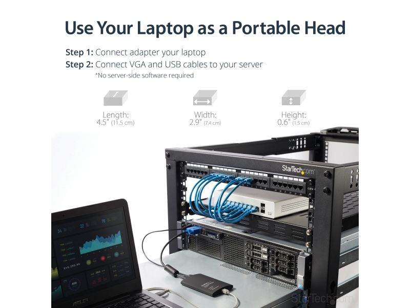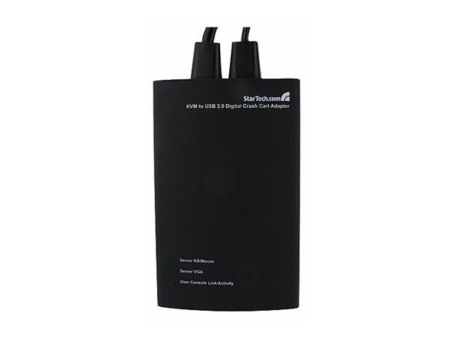 NOTECONS01 KVM-konsol till USB 2.0 akutvagn-adapter för bärbara datorer gör om din laptop eller minidator till en bärbar akutvagn för servrar och du slipper släpa runt på en stor och otymplig skärm, tangentbord och mus. Adaptern levererar VGA-strömmen från en värddator till en bärbar dator och emulerar utdata från tangentbord och mus för enkel åtkomst samt kontroll över anslutna servrar, datorer och andra fjärradministrerade enheter.