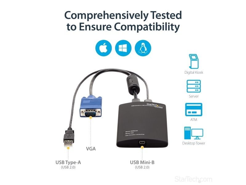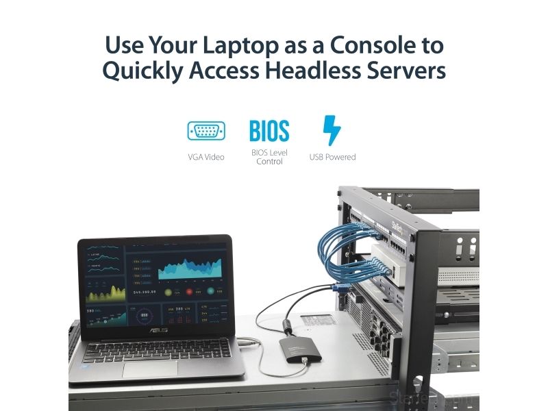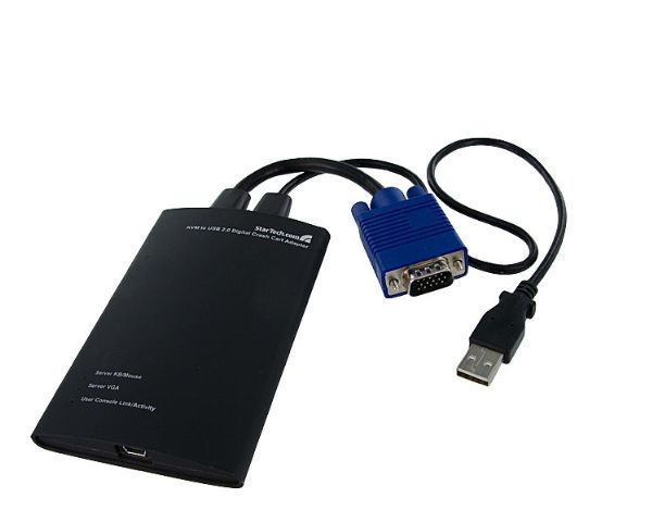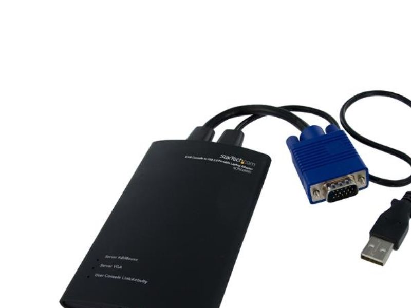 Laptop KVM server-konsoladaptern garanterar full kontroll över anslutna enheter och ger omedelbar åtkomst till POST-skärmen och BIOS plus förmågan att hantera full konfiguration av ansluten dator eller maskin; administratörer kan ansluta till en fjärradministrerad server/enhet utan att behöva en dyr hyllmonterad LCD-konsol eller otympliga skärmar, tangentbord och datormöss.