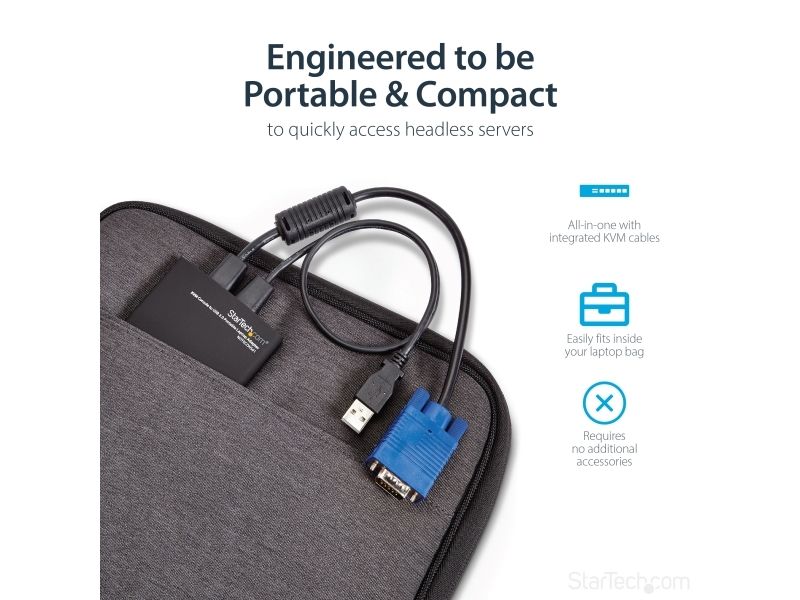Den här USB-strömförsedda adaptern har, med bärbarhet för mobiladministratören och reparatören i åtanke, en liten design som inte behöver några tillbehör för att ansluta till de flesta servrar och den kräver ingen installation av mjukvara på servern. Adaptern i fickformat får dessutom sin ström från USB-anslutningen på servern så att den bärbara datorn klarar sig längre på sitt batteri.