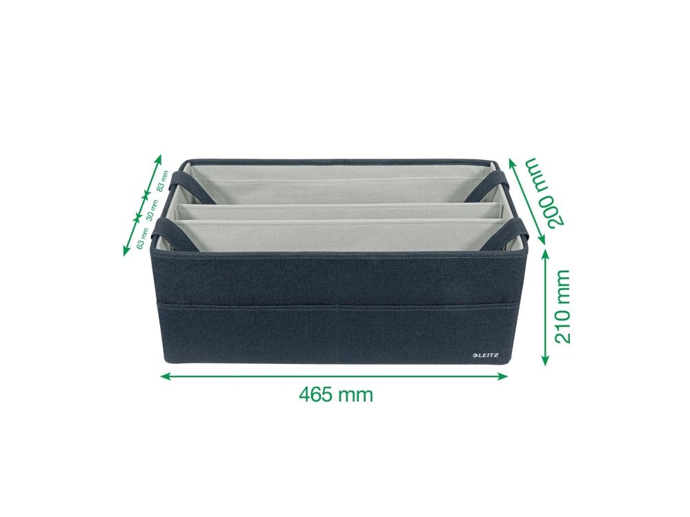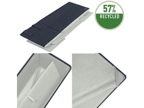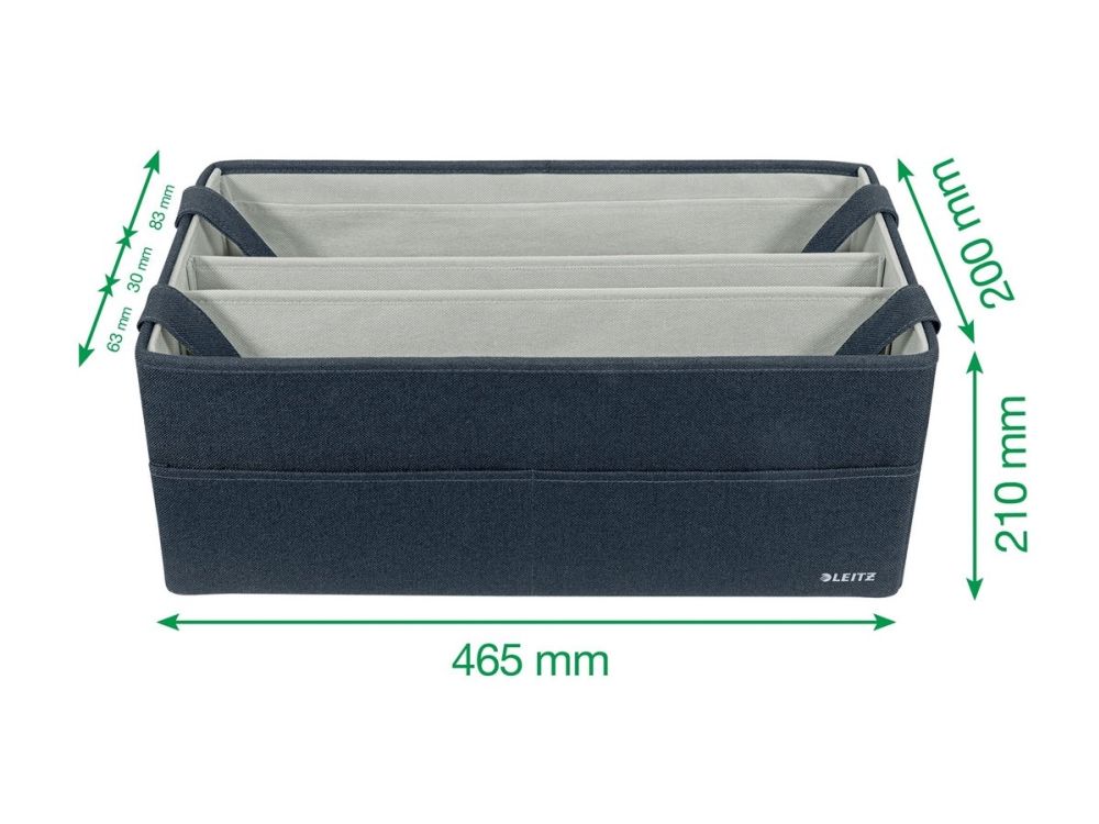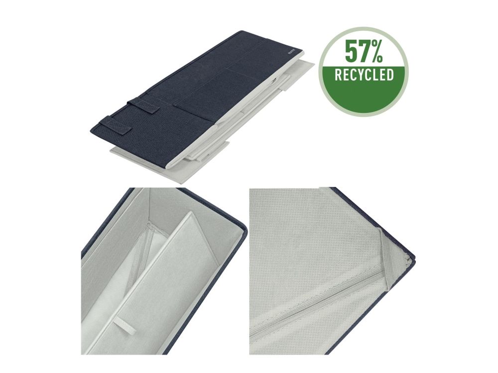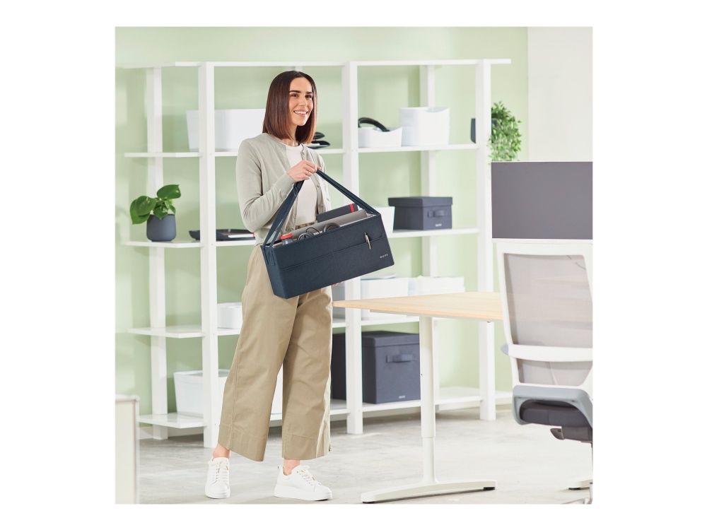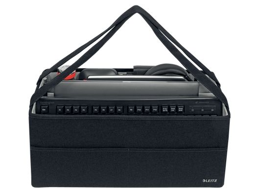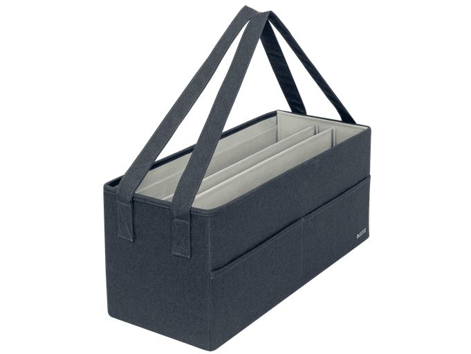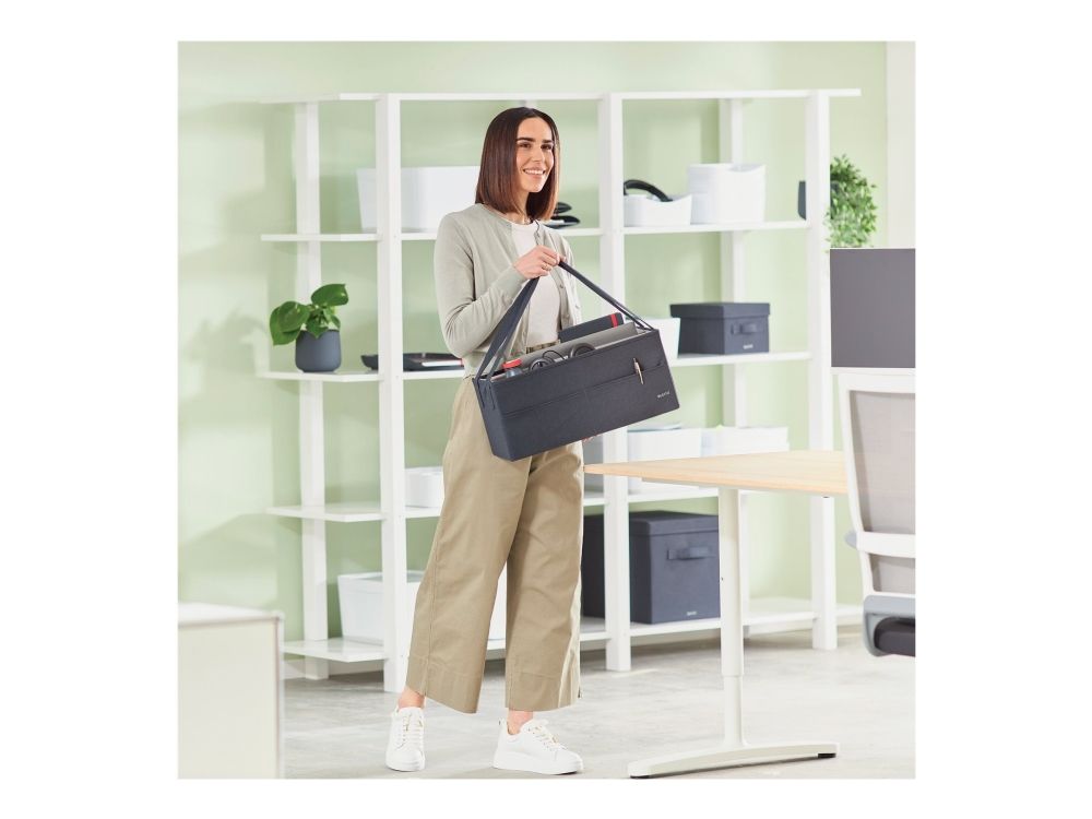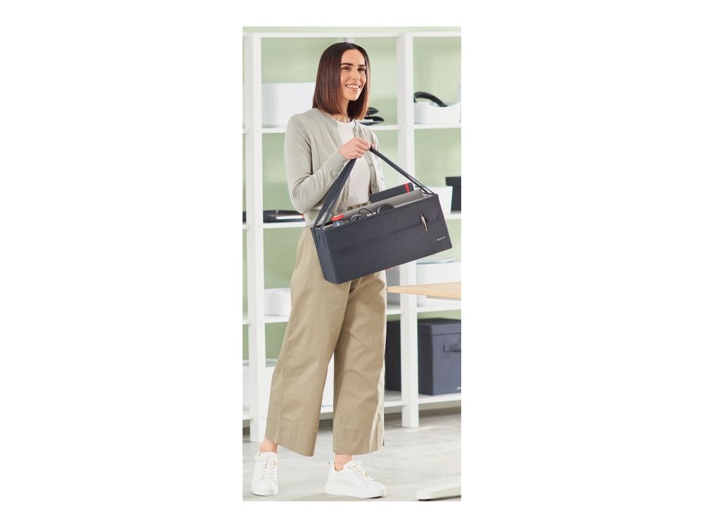 Føl dig hjemme, uanset hvor din dag fører dig hen, med opbevaringsserien i stof fra Leitz. Med sit minimalistiske design og indbydende matgrå fløjlsfinish kan du være stilfuld, mens du forbliver organiseret på kontoret, hjemme, arbejder hybrid eller hvor som helst derimellem. Leitz hot desking-arbejdstaske i stof har tre separate rum, der giver dig mulighed for at opbevare og bære alt, hvad du har brug for til den kommende dag. Denne moderne og praktiske opbevaringstaske har plads nok til at rumme en bærbar computer på op til 18'', et tastatur i fuld størrelse, en mus, et opladerkabel, et headset, en notesbog og en vandflaske. Den passer i skabe eller reoler med minimumsmål på 480 x 210 mm og en højde på 220 mm. Også velegnet som lærertaske. Fremstillet af blødt materiale forstærket med recirkuleret pap for styrke og holdbarhed. Samlet 57% recirkuleret materiale. Når den ikke er i brug, er tasken fuldt sammenfoldelig, så den nemt kan gemmes væk. Navneskiltet, der følger med tasken, giver dig mulighed for nemt at identificere den i fælles rum. Denne hot desking-arbejdstaske med bærehåndtag i justerbar længde er den perfekte tilføjelse til dit hjem, kontor eller skole for at sikre, at du forbliver afslappet og produktiv hele dagen.