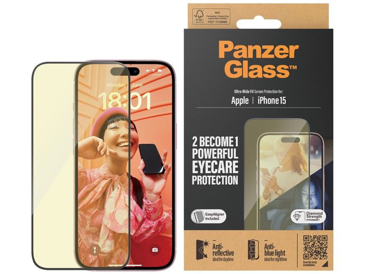 Anti-reflective? Yes! Anti-blue light? Yes! Scratch, shock and drop-resistant? Yes! This new screen protector from PanzerGlass takes eye and phone protection to the next level. It minimizes reflections from the sun and artificial lighting, so you can always see what's on your screen, and reduces the strong blue light from your screen which can cause eye strain and fatigue. And as an extra bonus, the screen protector also has a smudge-free coating that reduces traces of fingerprints and grease, giving you a clear view of your screen.And the screen protection? It's outstanding! This screen protector keeps your phone screen safe from accidental bumps, crushing falls and other hazards of everyday life. Or to put it in more sustainable terms: It protects and prolongs the lifetime of your phone, thereby postponing the need to produce new phones. Extending the lifetime of electronic devices is one way of working toward a more sustainable future. And to top it all off, this screen protector comes in a FSC-certified box that can be recycled.The screen protector comes with an EasyAligner that makes installation a piece of cake (seriously!), and to make it even easier, we've included step-by-step instructions as well as a QR code for quick access to our online how-to video. And remember: Once the screen protection is applied, you'll never again fear the sight of your phone tumbling to the ground screen first. This may not happen, but if it does, you'll regret not having clicked "add to cart".The screen protector is Ultra-Wide Fit, meaning it covers the front surface of your phone to provide superb screen protection and a complete screen view, while still leaving a little room around the edges for a PanzerGlass case. If you want 360-degree phone protection, combine the screen protector and case with a PanzerGlass PicturePerfect camera lens protector.