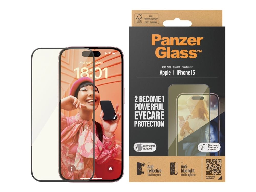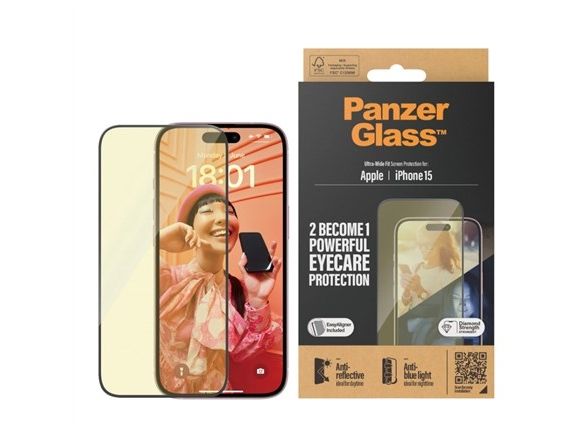 PanzerGlass™ | Ultra-Wide Fit - Skjermbeskyttelse for mobiltelefon - EyeCare Protection| Apple iPhone 15