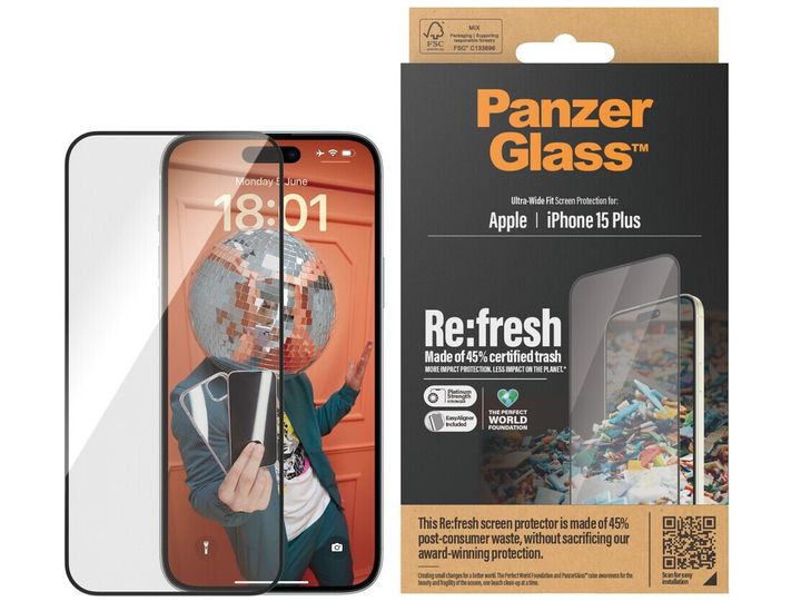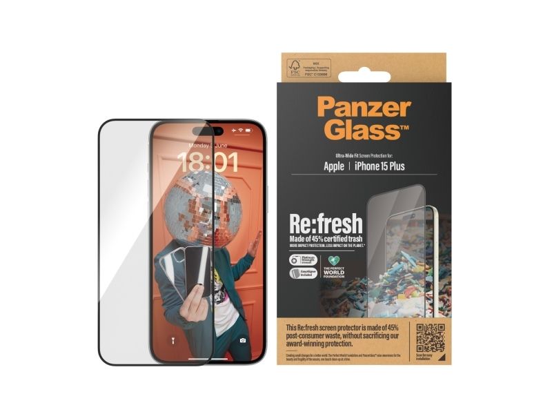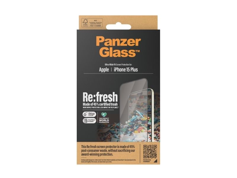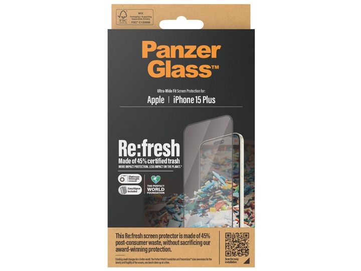 Want less waste? And more screen protection? The brand-new Re:fresh screen protector from PanzerGlass is made of 45% certified trash and will keep your screen safe from accidental bumps against sharp-edged dangers, crushing falls onto stone-hard pavements and other hazards of everyday life. The scratch, shock and drop-resistant screen protector even has a smudge-free coating that reduces traces of fingerprints and grease to give you a clear screen view. And this product comes in a box made of recyclable FSC-certified paper.Prolonging the lifetime of our devices, thereby postponing the need to produce new ones, is one way of working toward a more sustainable future. Another is to protect the world's wildlife and reduce plastic waste in nature. To this end, PanzerGlass has teamed up with non-profit organization The Perfect World Foundation to support "Project Ocean". For each Re:fresh sold, PanzerGlass will make a donation to the project, dedicated to protecting marine life, for instance by reducing the amount of plastic and ghost nets that end up in our oceans.The screen protector comes with an EasyAligner that makes installation a piece of cake (seriously!), and to make it even easier, we've included step-by-step instructions as well as a QR code for quick access to our online how-to video. And remember: Once the screen protection is applied, you'll never again fear the sight of your phone tumbling to the ground screen first. This may not happen, but if it does, you'll regret not having clicked "add to cart".The screen protector is Ultra-Wide Fit, meaning it covers the front surface of your phone, providing a complete and crystal-clear view of your screen, while still leaving a little room around the edges for a PanzerGlass case. If you want 360-degree phone protection, combine the screen protector and case with a PanzerGlass PicturePerfect camera lens protector.
