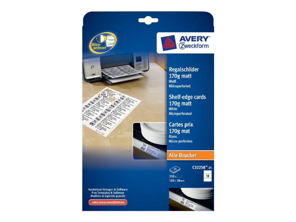 Avery Zweckform C32258-25 - Matt - perforert - matt hvit - 105 x 38 mm - 170 g/m² - 350 kort (25 ark x 14 kort