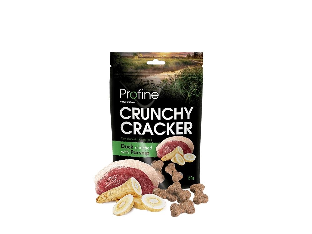 Vi anbefaler Profine Crunchy Cracker - Duck & Parsnip som forkælelse, eller som træningsgodbidder.