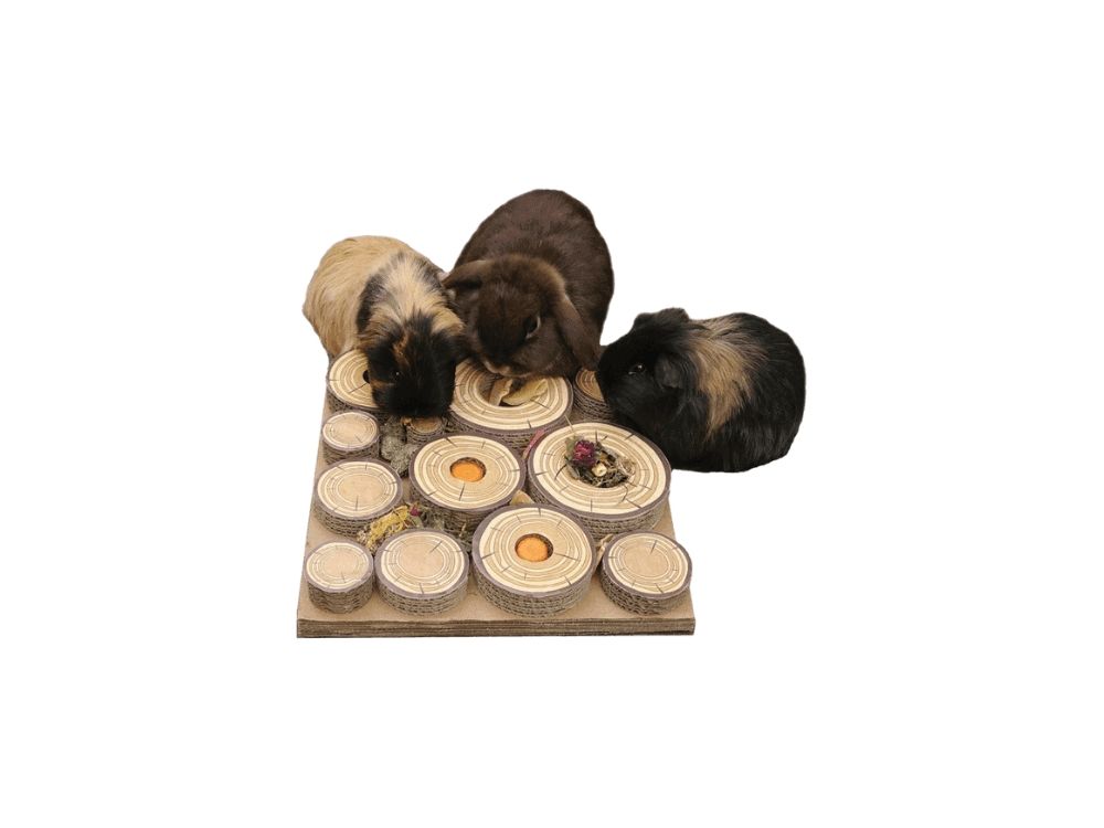 Rosewood Maze-A-Log Treat Challenge Inspireret af Shred-a-log tager Maze-a-log forskellige størrelser af bølgepap-"bjælker" monteret på et tykt 30 x 30 cm-bræt for at skabe en "kedsomhedsbrydende" fodringsudfordring for kaniner, marsvin, rotter, hamstere og endda ildere. Søg og krads, sjov at tygge i, gør den daglige fodring til en stimulerende aktivitet.