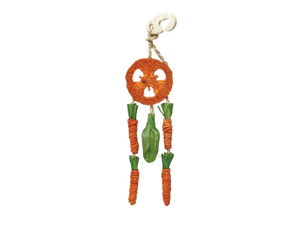 Rosewood Boredom Breaker Carrot Dream Catcher Carrot Dream Catcher er designet til kaniner og marsvin, og er perfekt til at lege med og tygge i. Perfekt aktivering som dit kæledyr kan bruge en masser af tid og energi på. Lavet af fuld fordøjelig materiale, naturlig loofa og majsblade. Størrelse:  34cm lang Husk at give alt legetøj til dit kæledyr under opsyn. Materialet er fuld fordøjeligt, men bør ikke indtages i store mængder.