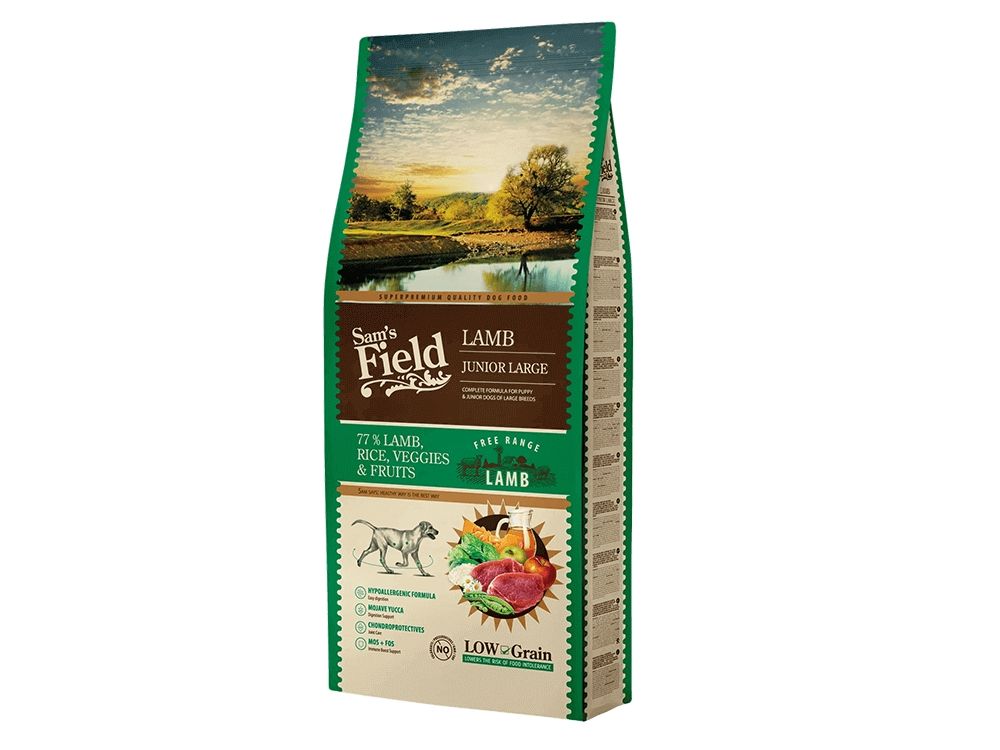 Sams Field Junior Large Lamb er uden farvestoffer, tilsætningsstoffer og korn. Foderet har alle de rigtige ingredienser som dækker din hunds næringsbehov.