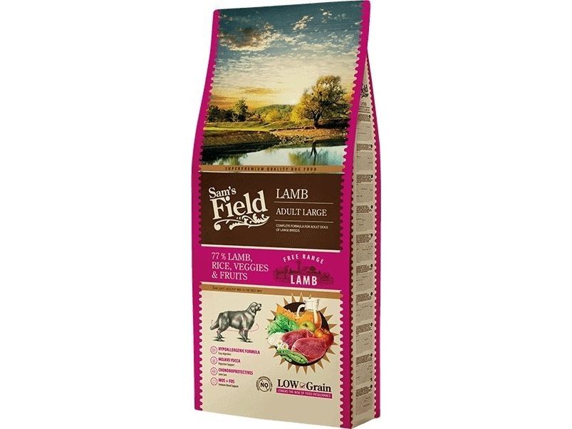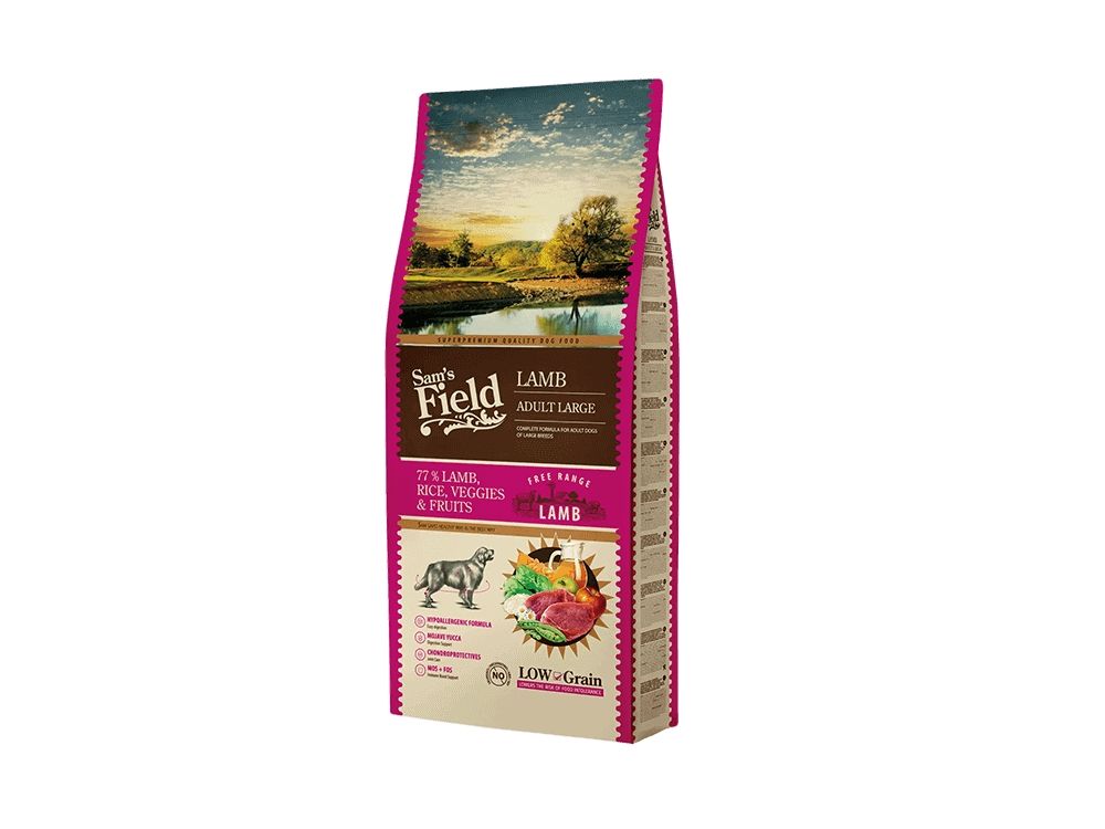 Sam’s Field Adult Large Lamb er for de store drenge i klassen. Der er mange gode grunde til at vælge foder, der er skræddersyet til store og tunge hunderacer. Med Sam's Field Adult Large Lamb får hunden (26%) Lam, der er fyldt med gode proteiner og vigtige aminosyrer. Det er godt for hundens helbred, når den får det den har behov