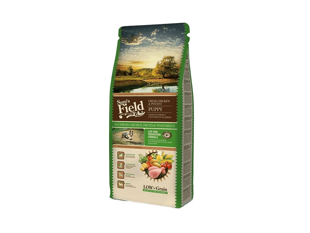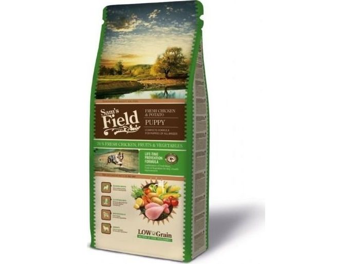 Sam's Field Puppy er fuldfoder af høj kvalitet, som er godt til hvalpe. Foderet er med kylling, grøntsager og frugt. Kyllingen giver en masse proteiner, der understøtter hundens muskler. Samtidig er foderet glutenfri og uden traditionelle kornsorter som havre, hvede, byg og rug. Glutenfrie produkter kan mindske foderintolerance hos hunden.