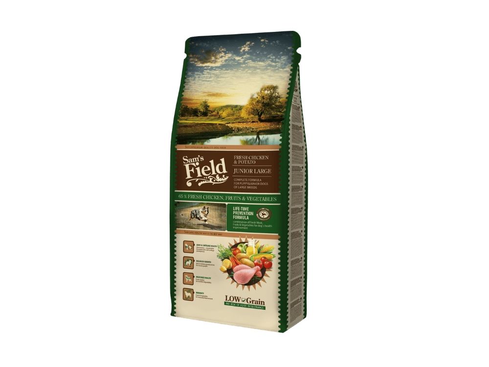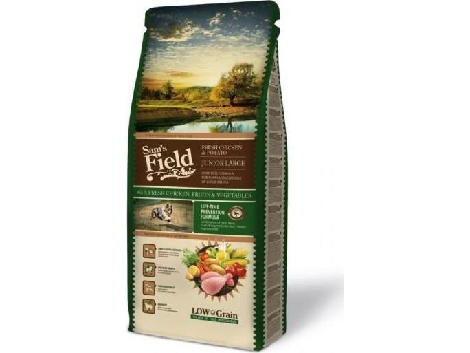 Sam's Field Junior Large er fuldfoder til hvalpe/unghunde af gigant- og store racer. Hundefoderet er med kylling, grøntsager, kartofler og majs. Kylling er velsmagende og med gode proteiner, som blandt andet er med til at vedligeholde hundens muskler. Grøntsagerne består også af en urteblanding der indeholder salvie, fennikel og basilikum. Det er med til at holde din hunds immunforsvar intakt. Marine Complex og havalger er med til at give hunden skinnende blank pels og understøtter et godt fordøjelsessystem. Hundefoderet er med glukosamin og chondroitin, som er godt til store hunde, fordi det hjælper på leddene.