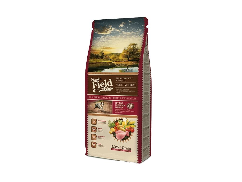 Sam's Field adult medium, er foder til mellemstore hunderacer. Fuldfoderet har ekstra indhold af fedt og protein, der hjælper hundens muskler når aktivitetsniveauet er højt.