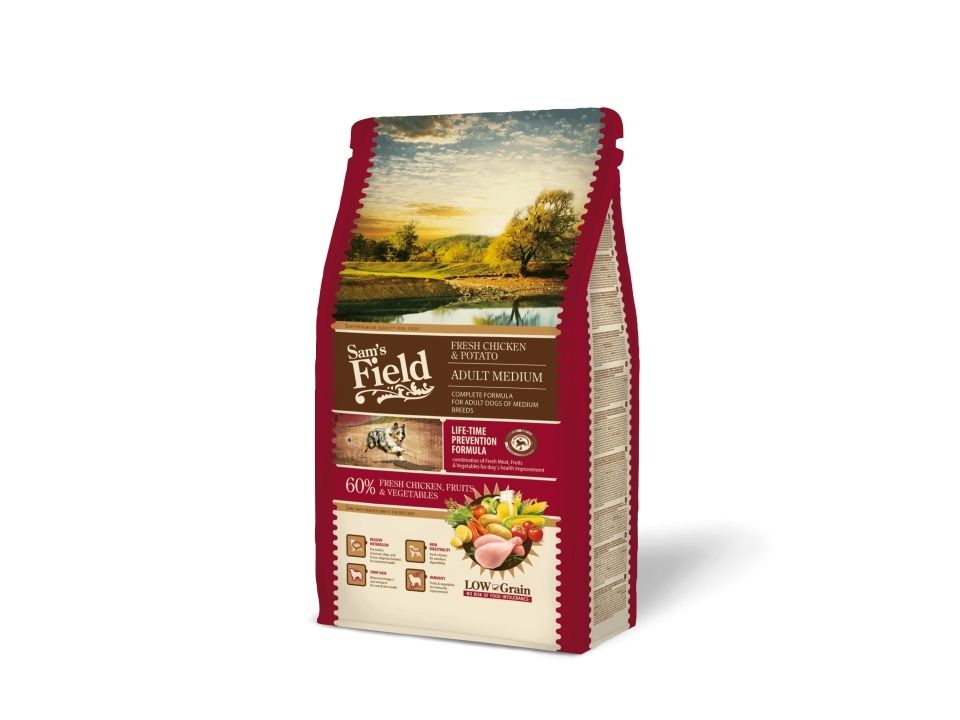 Et Low Grain foder til aktive, voksne hunde af mellemstore racer. Adult Medium indeholder en pillestørrelse, som er ideel til mellemstore racer. Low Grain opskriften i Sam's Field Adult Medium minimerer risici for foderintolerance, mens den supplerer alle vitale næringsstoffer, og giver hunden den energi, som er optimal for en normal og aktiv hund.