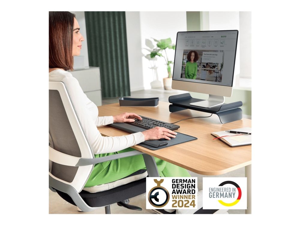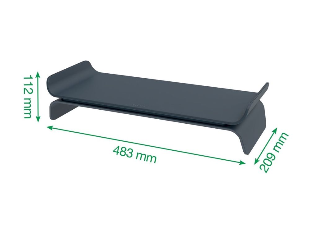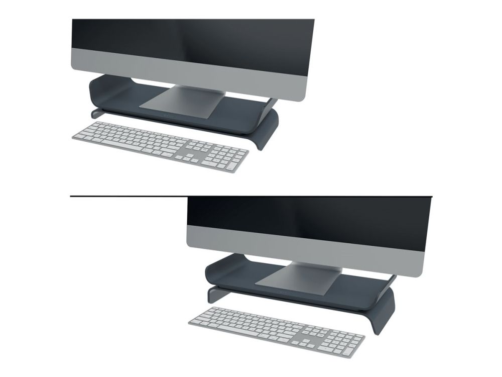 The Leitz Ergo Adjustable Computer Monitor Stand helps create a comfortable and ergonomic workspace by raising your monitor to an optimal viewing height. Designed to provide maximum comfort while sitting or standing, this monitor riser promotes a healthy posture and optimizes comfort for the neck and shoulders. The adjustable desk monitor stand has 2 height settings and will securely hold up to 27" monitor screens. There is also space underneath the desk riser to store a keyboard or other daily essentials to keep desks and work surfaces clutter-free. With its minimalist design and matt finish, this stylish monitor stand for desks can have a positive impact on wellbeing by effortlessly creating the perfect active working set-up.