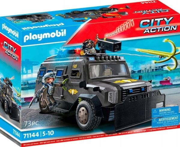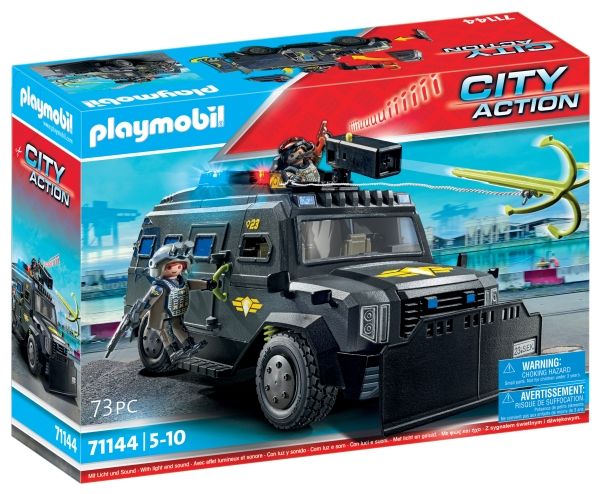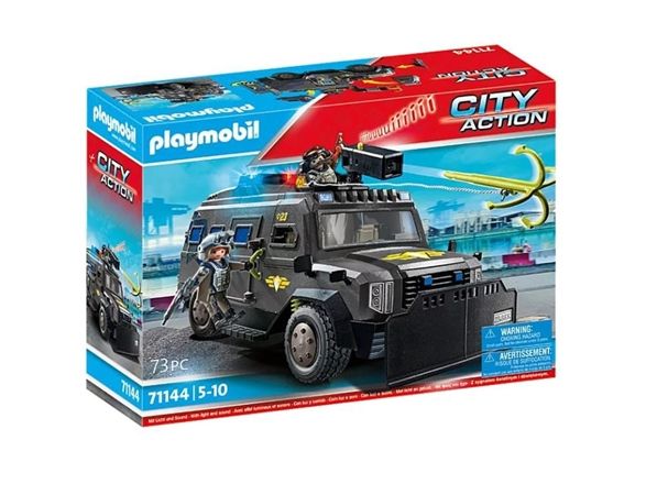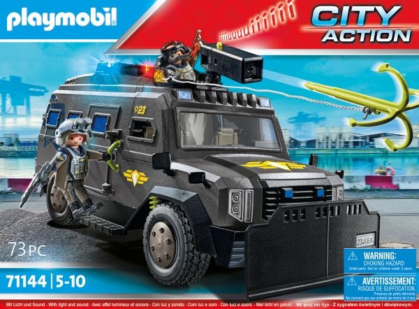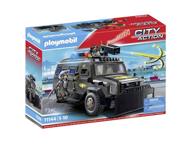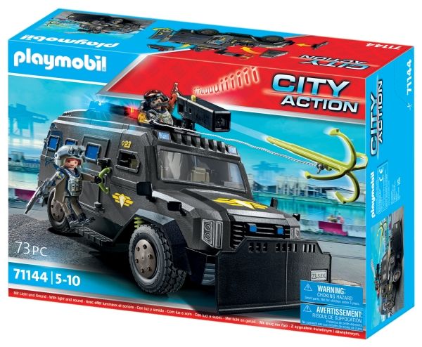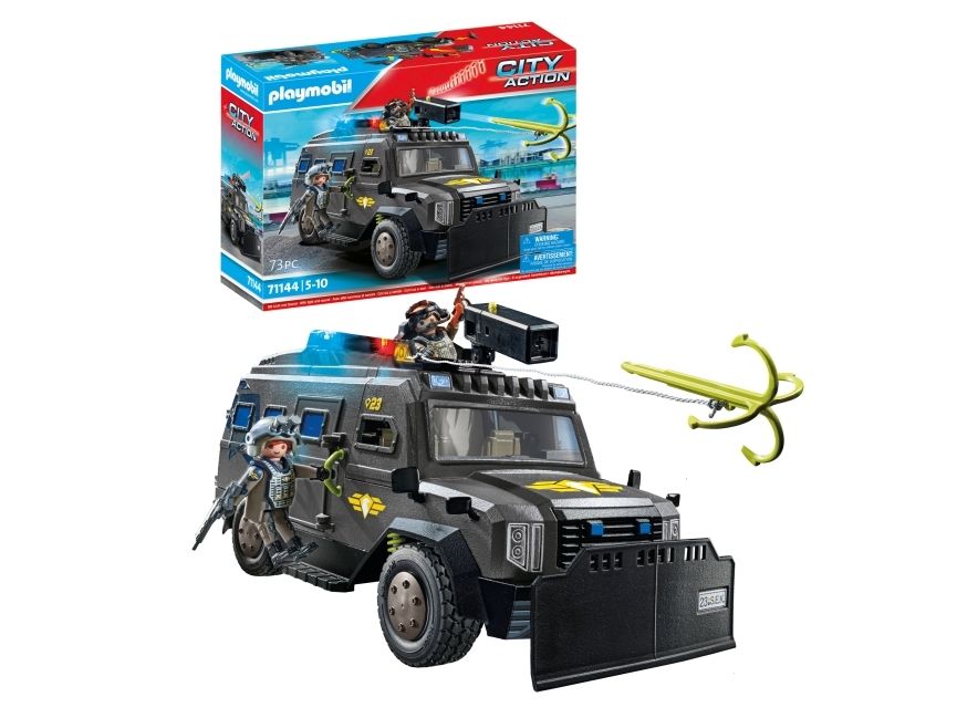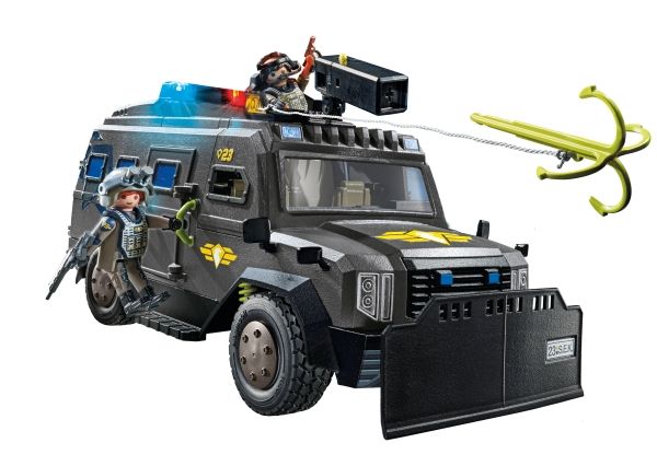 SWAT-ATV’en spotter alle forbrydere Takket være 4-hjulstrækket er det legende let at forfølge forbryderne i uvejsomt terræn. Og skulle vejen være spærret, sørger plovbladet på den forreste kofanger for hjælp. Taget og side- og bagdørene kan åbnes. På taget er der et tårn, der kan bemandes, og hvorfra der kan skydes en entrehage eller en vandpil ud. Med lys og lyd. Stig ind i den moderne SEK-ATV og hjælp SWAT-teamet. Med actionfyldte funktioner og robuste køretøjer garanterer de nye legesæt et væld af nye, spændende specialoperationer til alle fans af PLAYMOBIL-politiet. En flot gave til jul eller fødselsdag til børn fra 5 år.