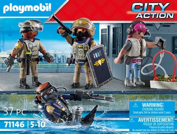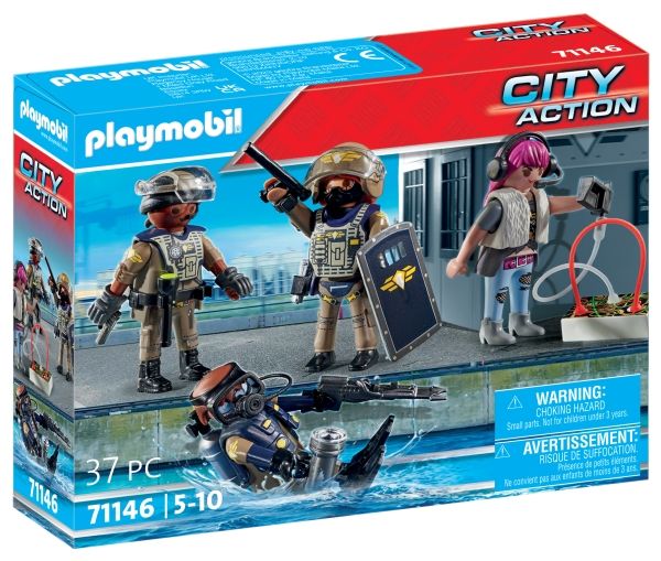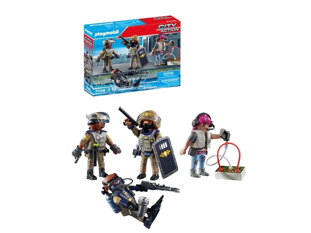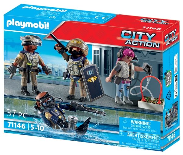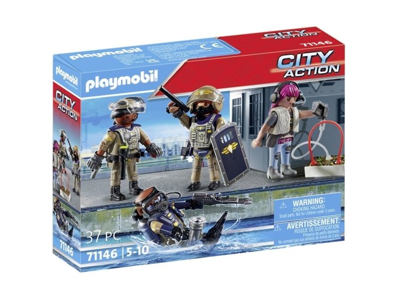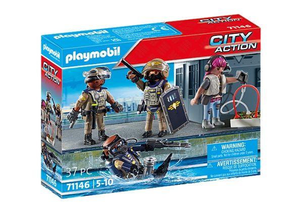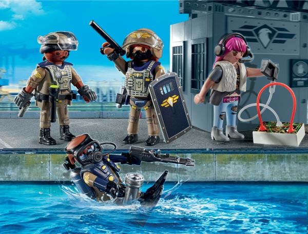 Specialkommandoen SWAT skal altid i aktion, når PLAYMOBIL-politiet har brug for ekstra hjælp. Politi-legetøjet indeholder alt, hvad små politifolk behøver til at sammensætte hurtige udrykningstropper som en SWAT-dykker, en indsatskoordinator og en SWAT-politimand. Med sin specialudrustning er teamet lige i hælene på den flygtende skurk. Forbryderen har ikke en chance mod denne effektive Task Force! Med detaljerige bygninger, realistiske køretøjer og autentiske figurer indbyder PLAYMOBIL City Action-serien til utallige fantasifulde rollelegseventyr.