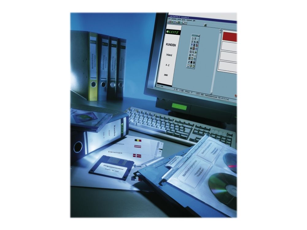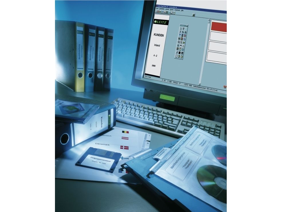 Ryggetiketter for PC-utskrift som enkelt gir deg lettleste og tilpassede etiketter til dine permer. Det brukervennlige, web-baserte verktøyet "Easyprint" hjelper deg med å designe dine etiketter.