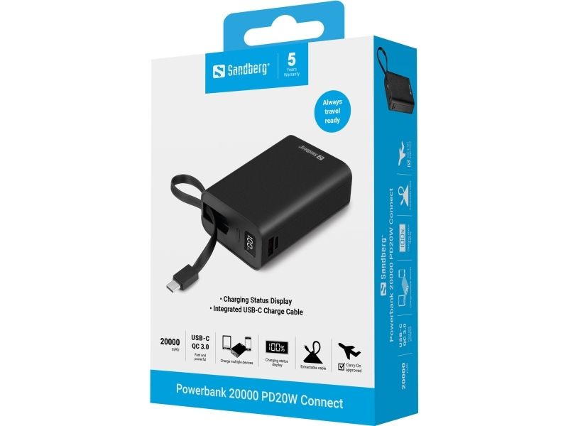The Sandberg Powerbank 20000 PD20W Connect offers reliable power storage for devices such as tablets and mobile phones. Its capacity of 20,000 mAh ensures that users can keep their devices charged throughout the day, making it an ideal companion for travel or long outings. The built-in LCD display provides battery status, allowing users to monitor the remaining power before needing to recharge the power bank itself. Featuring integrated USB-C and USB-A cables, it simplifies the charging process without the need for additional accessories. Moreover, the power bank supports Quick Charge 3.0 technology which enables fast charging, ensuring your devices replenish power swiftly. Compliant with multiple standards such as FCC and RoHS, it functions efficiently while adhering to safety and environmental regulations. The combination of versatility with two output connectors, along with robust construction, makes this power bank essential for anyone relying on their electronic devices on the go.