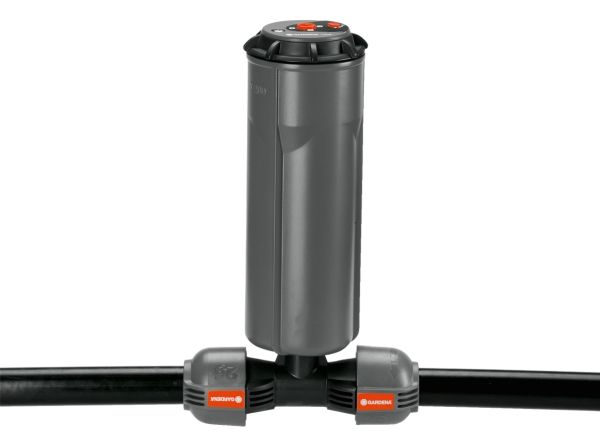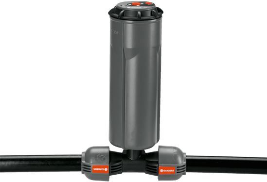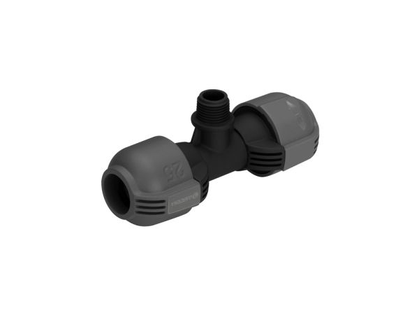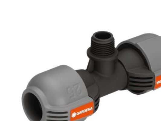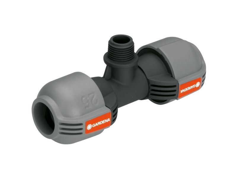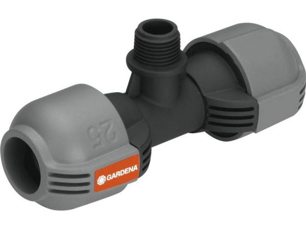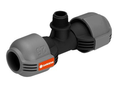 As part of the GARDENA Sprinklersystem – the GARDENA T-piece 25 mm x 1/2" male thread serves to connect the Pop-up Sprinkler S 80 (Art. No. 1569-26), and the Turbo-driven Pop-up Sprinkler T 100 and T 200 (Art. No. 8201-29 and 8203-29) within the run of the pipe. Through the patented "Quick & Easy" Simple Connection Technology, pipe assembly or -disassembly is done without tools through simple turning of the screwed fitting by 140°. For water-tight, safe operation, the thread connection of the T-piece is self-sealing.
