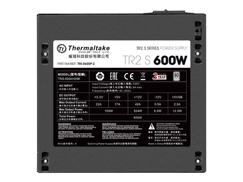Thermaltake TR2 S 600W - Strømforsyning (intern) - ATX12V 2.3/ EPS12V - 80 PLUS - AC 230 V - 600 Watt - aktiv PFC - Europa - svart
