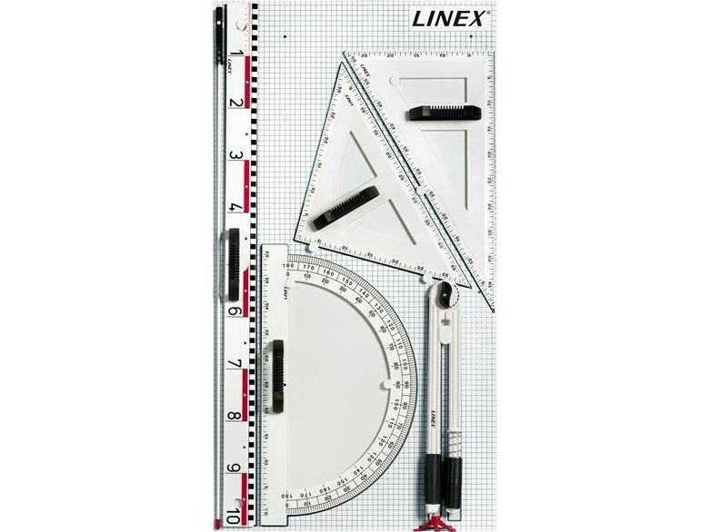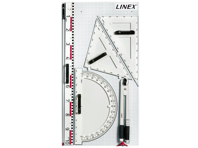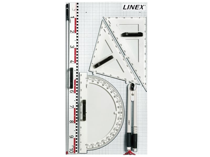 Lineal med decimeterindddeling og håndtag 100 cm, pegepind 100 cm, passer med magnetisk trefod 45 cm, 45 grader trekant med håndtag 50 cm, 60 grader trekant med håndtag 50 cm samt 180 grader vinkelmåler med håndtag 50 cm.