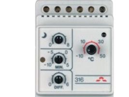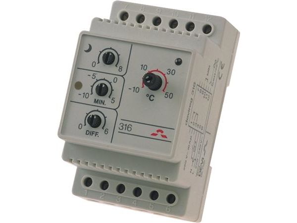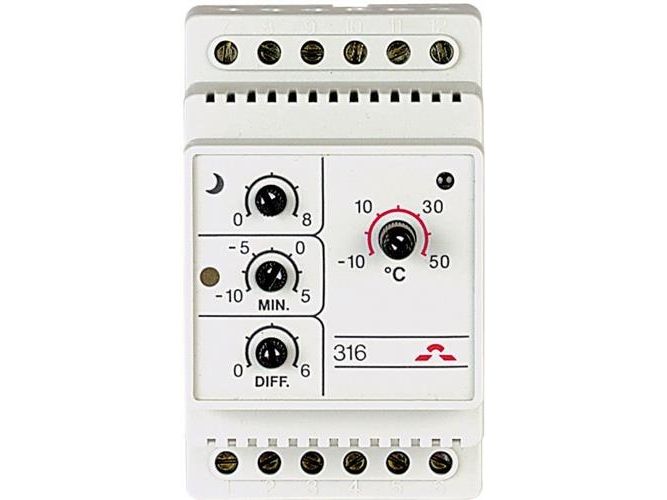 DEVIreg 316 er en enkel, elektronisk termostat med forbedret funktionalitet til installation i elskabe med DIN-skinnebeslag. Termostaten bruges primært til frostsikring på tage, i tagrender og nedløbsrør. Desuden kan den anvendes til styring af rum- og gulvtemperatur, ventilation, køling eller snesmeltning på jorden, rørsikring og lignende installationer.