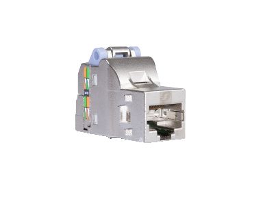 8-polet RJ45 konnektor til montage på kabler. Stufferkappen (grøn) er monteret på konnektoren og sikrer derved hurtig montage.Konnektoren er forsynet med farvekodeterminering for hhv. EIA/TIA 568A og 568B.
